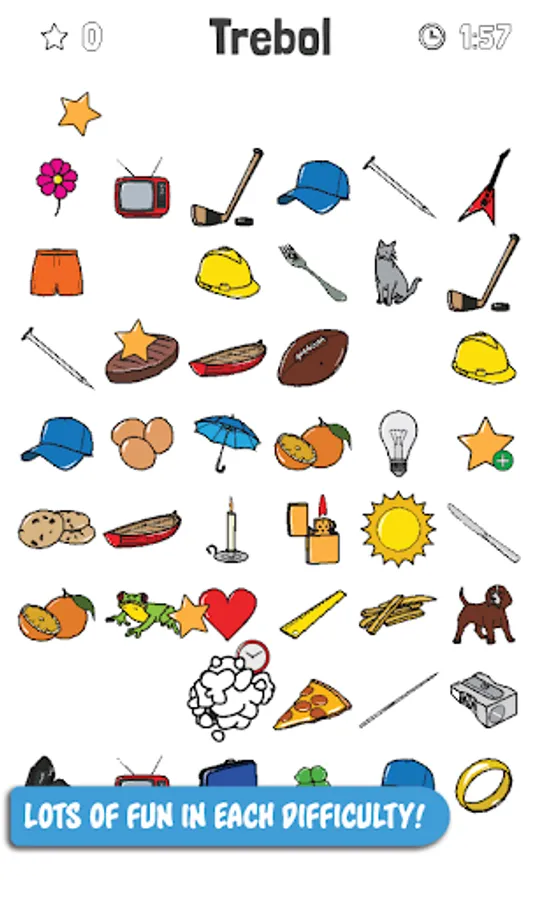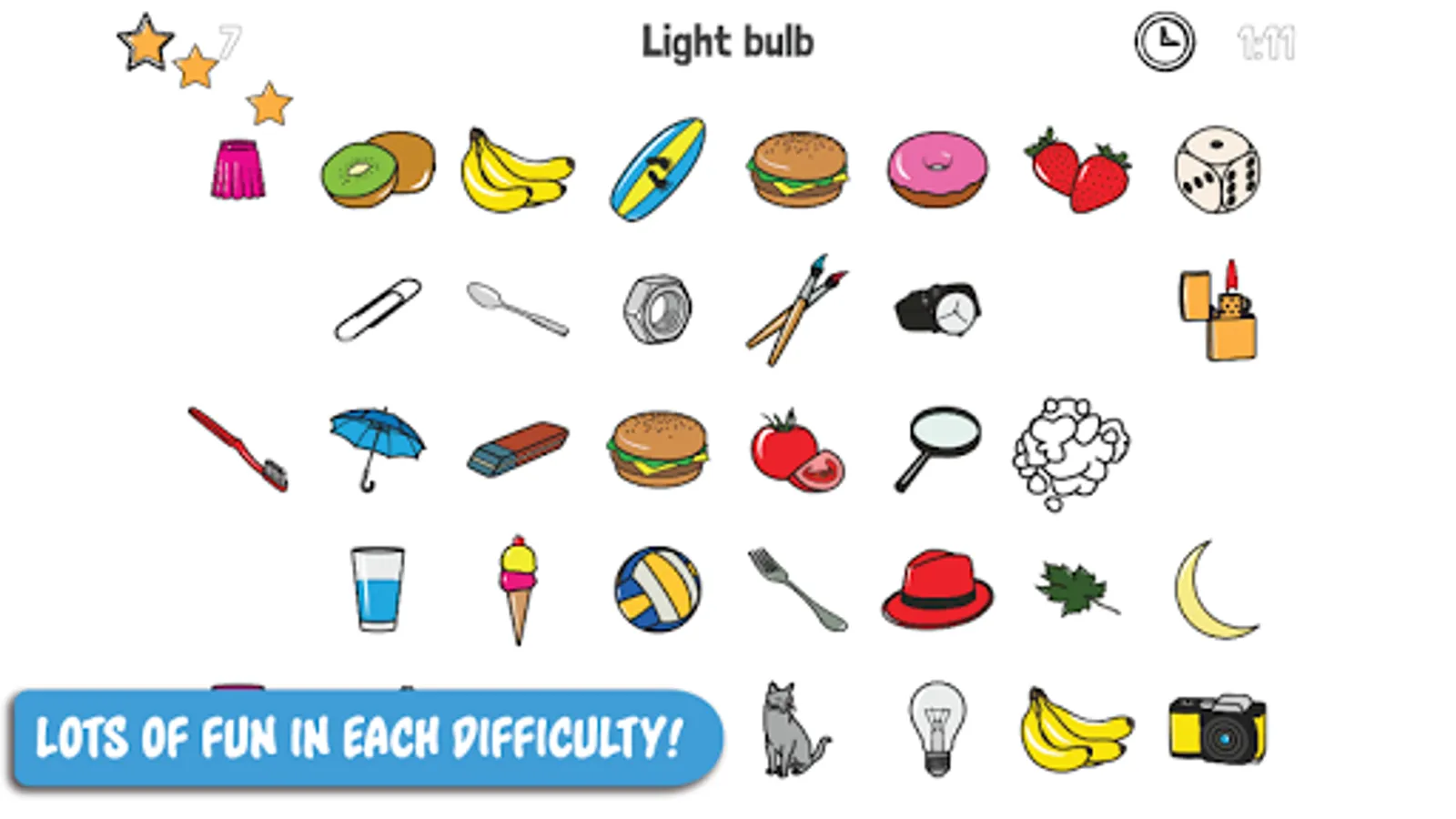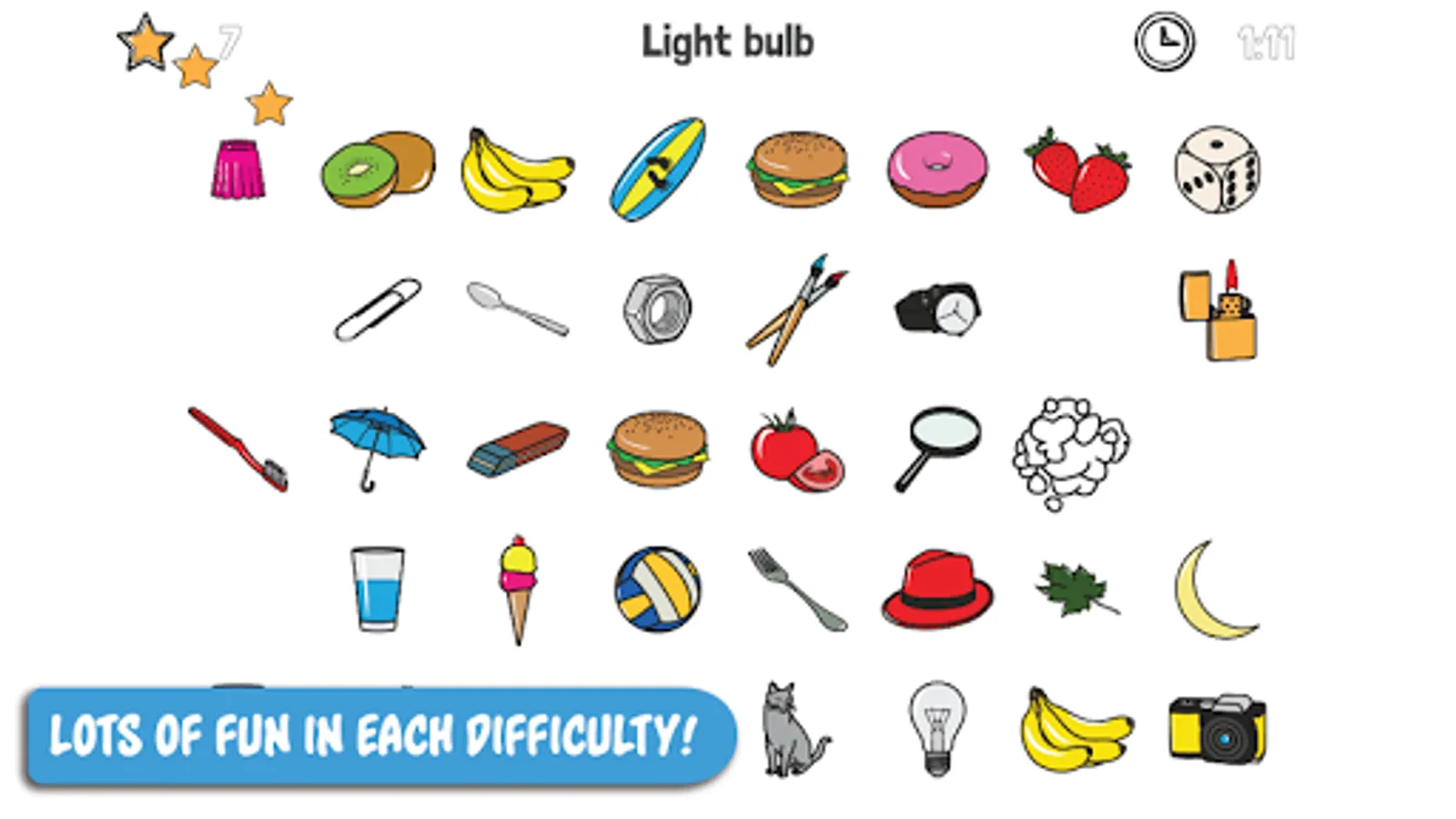 Try to find as many hidden objects as you can before the time runs out! Have fun and enjoy nice doodles of real objects while playing Find objects!
