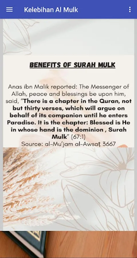 This Surah has 30 verses divided into 2 Rukus/Sections. It takes its name from verse 1: “…. تَبَارَكَ الَّذِي بِيَدِهِ الْمُلْكُ” ( Blessed is He in whose hand is dominion…..) where the word “الْمُلْكُ” meaning “Dominion/Sovereignty” appears. This Surah was revealed in Mecca most probably during the early days of Muhammad’s proclamation of his prophethood.
