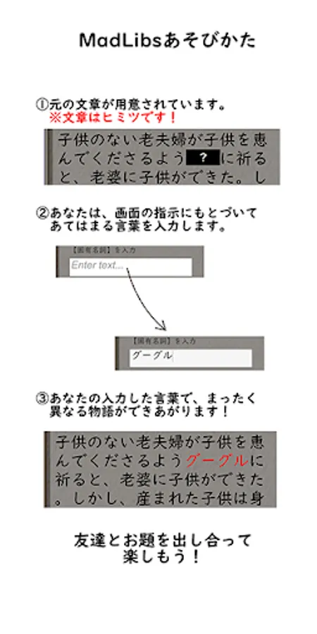 By setting the words you have entered in the blanks, a nonsense sentence that is completely different from the original sentence is completed!
