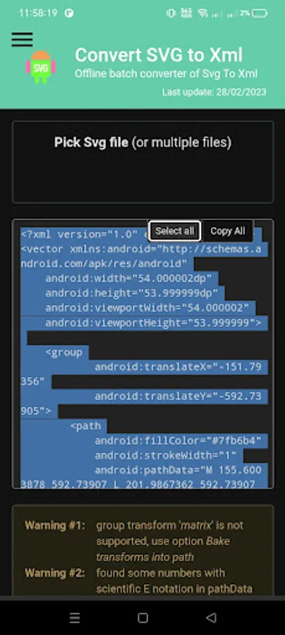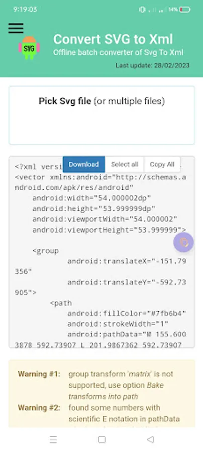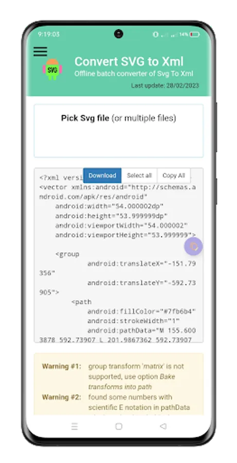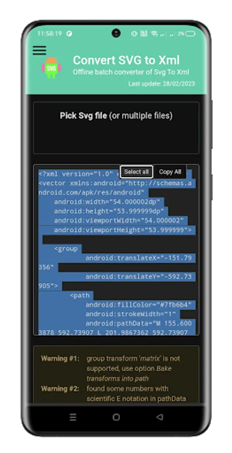 Svg To Xml is a must-have tool for anyone who works with SVG images and Android development. With this app, you can save time and effort by easily converting SVG files into XML format. You can then use these XML files in your Android projects, allowing you to add beautiful and scalable graphics to your apps.