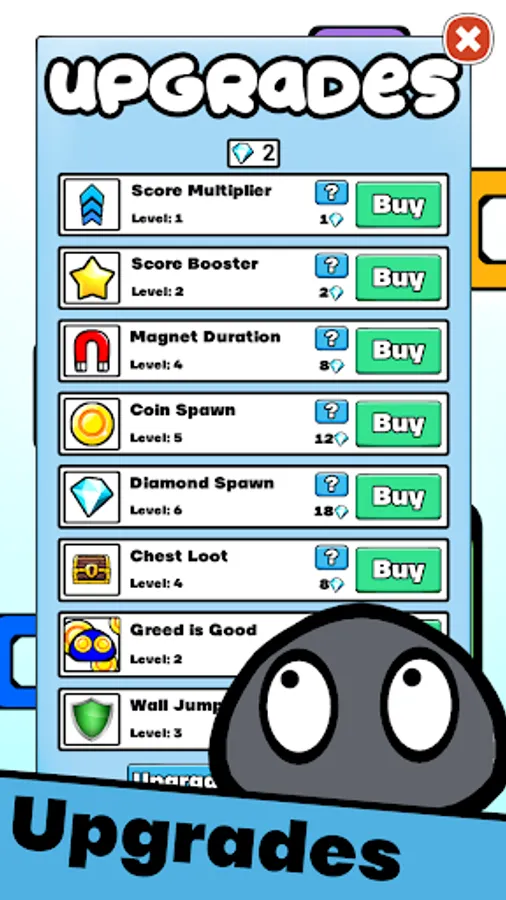▪️ upgrades: score multiplier, score booster, magnet duration, coin spawner, diamond spawner, wall jump