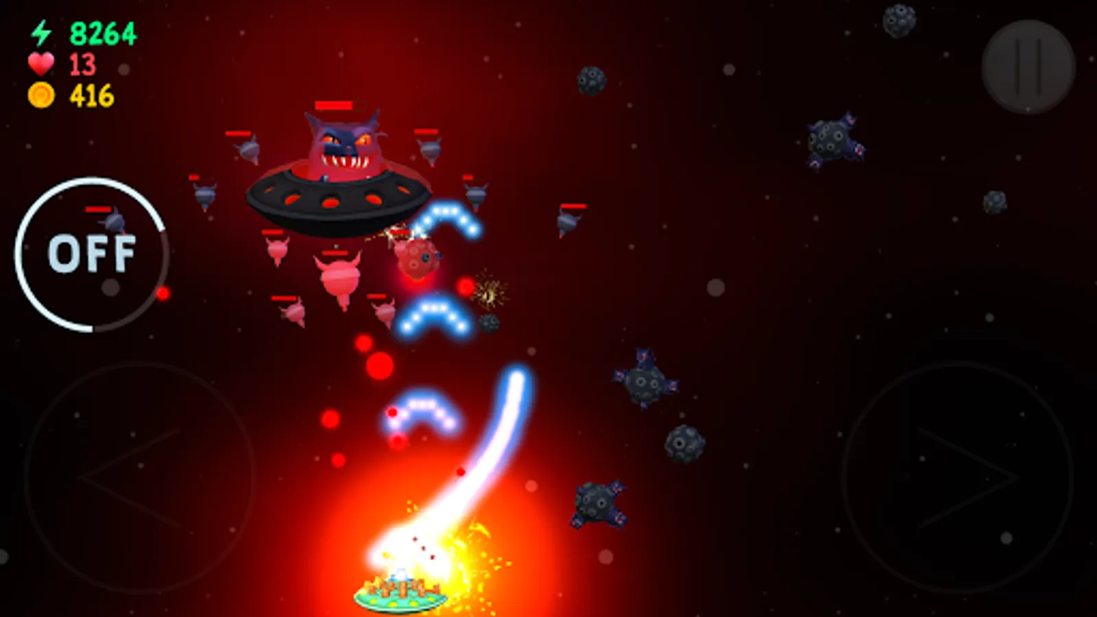 Fearlessly make your way to the dimension of black cats to get in a space battle with bosses and repel their increasing attacks! Shoot back at kamikaze cats.