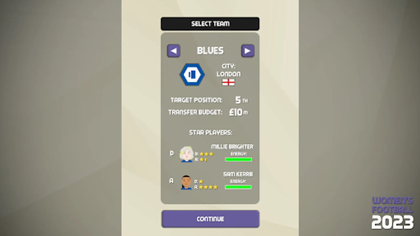 Women’s Football 2023 is the world’s first football title to focus exclusively on the women’s game! Manage five a side versions of the top women’s football teams from across Europe and chase the league trophy with a giant, turn a mid-table side into a championship challenger, or guide a struggling outfit to avoid relegation. Whoever you choose make sure you achieve your target position or you’ll face the sack!