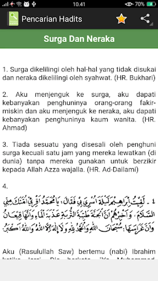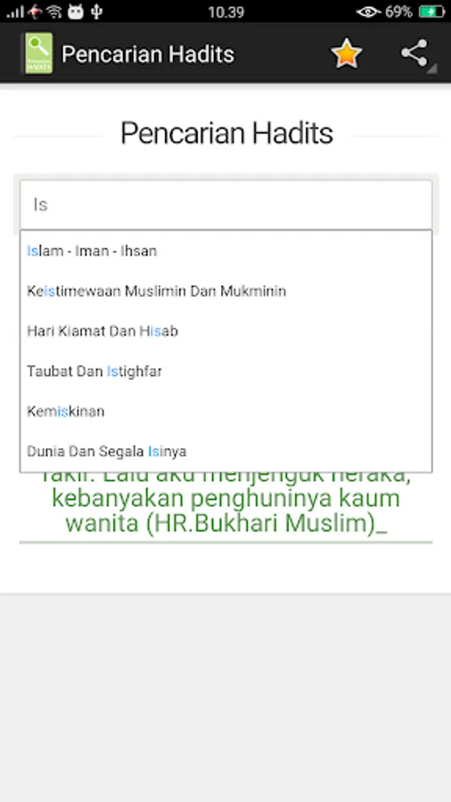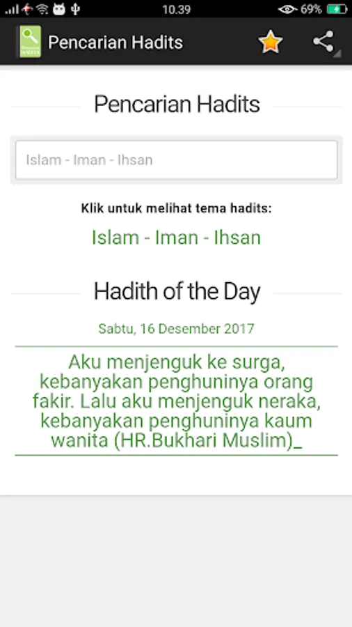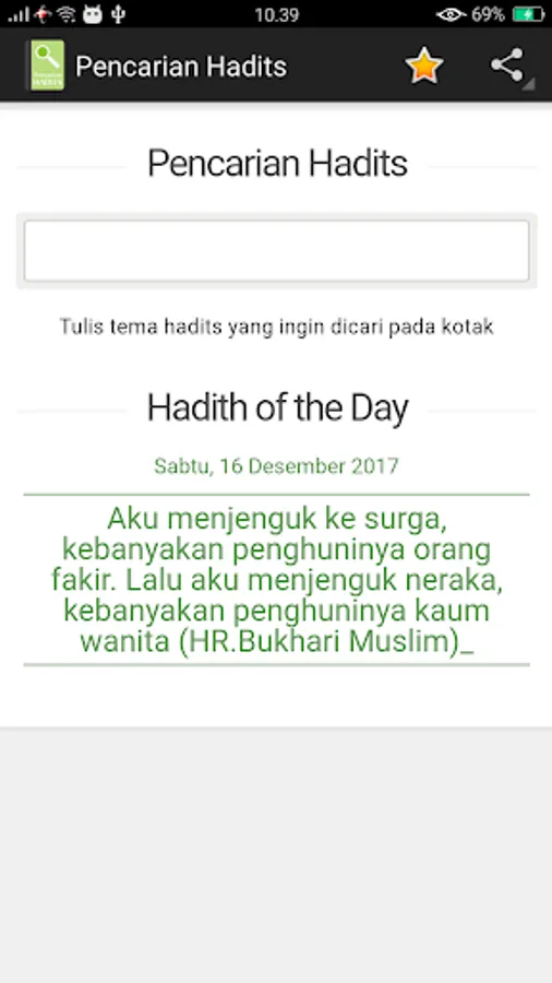 In addition to searching the hadith, this application also provides a feature "Hadith of the Day" which gives you a random quote hadith every day.