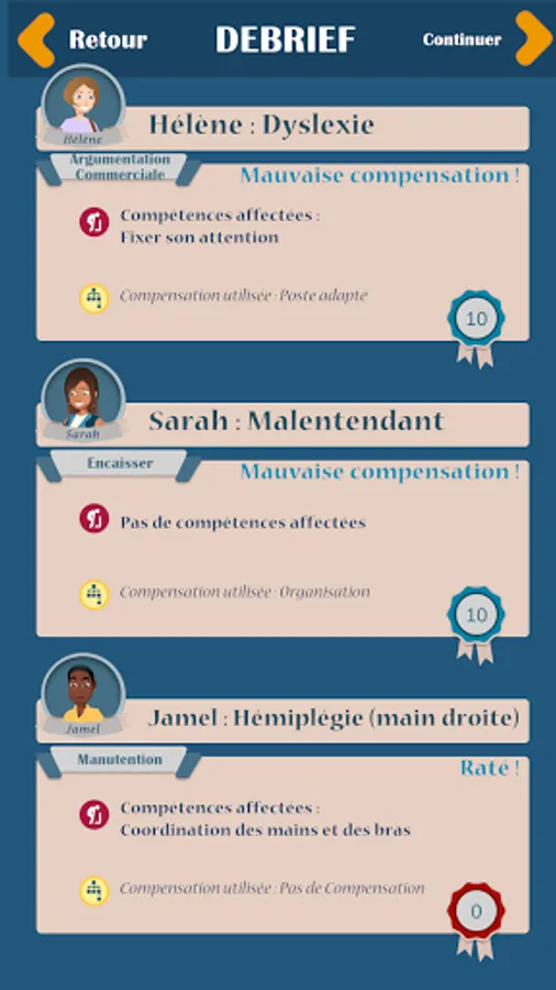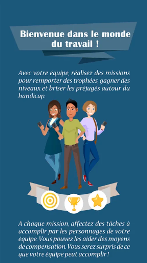 Welcome to the world of work! With your team, complete missions to win trophies, gain levels and break down prejudices around disability. On each mission, assign tasks to be completed by the characters on your team. You can help them with the means of compensation. You will be surprised at what your team can accomplish!