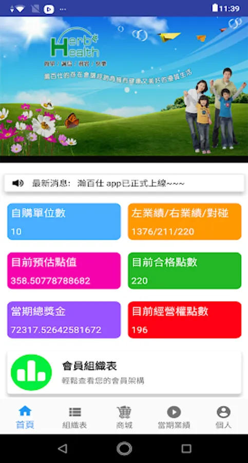 This is the app of the company, which has a mall, membership organization table, current performance and bonus details.
