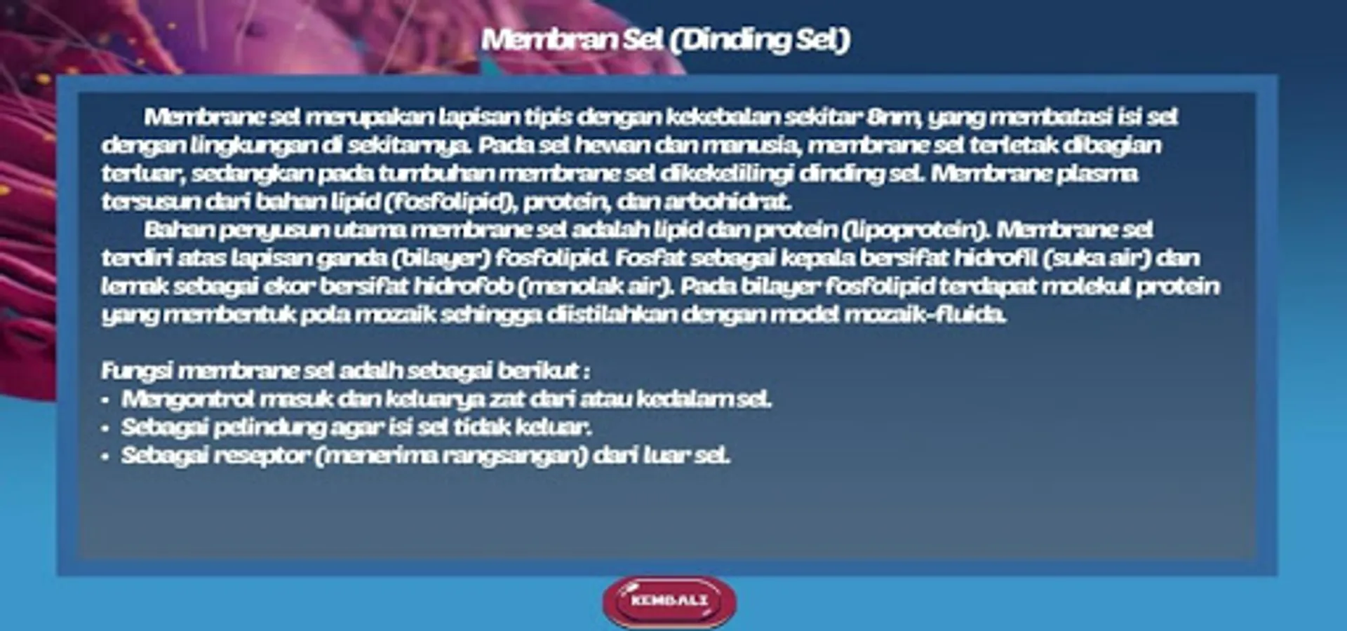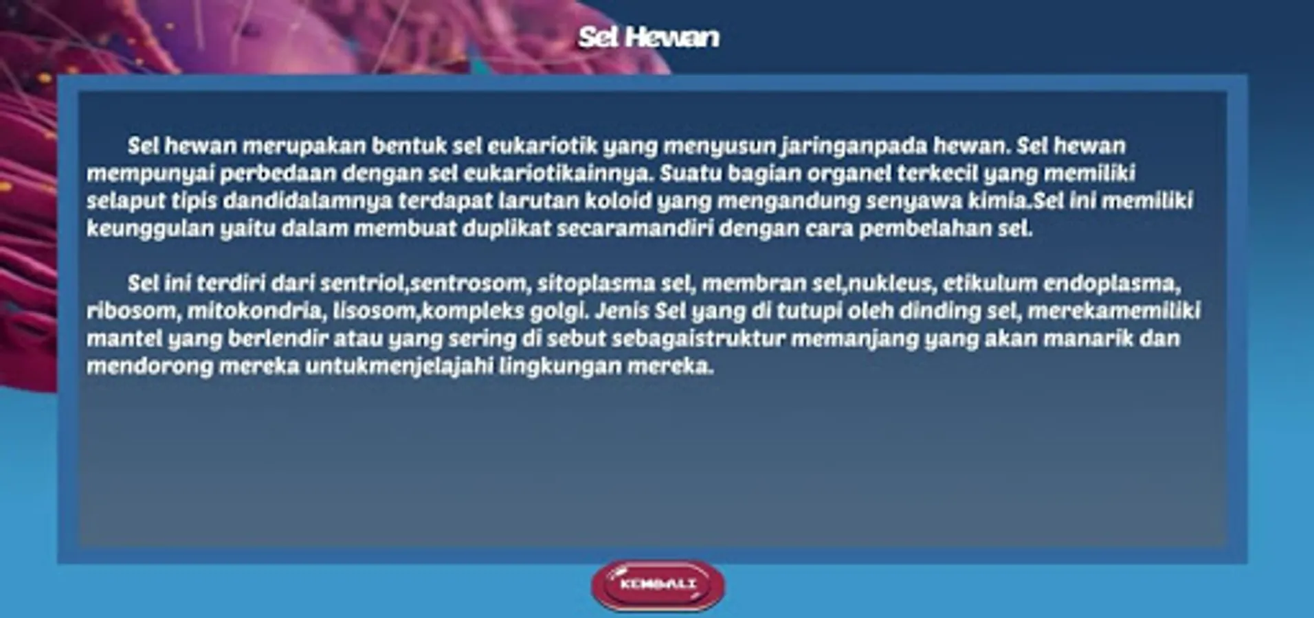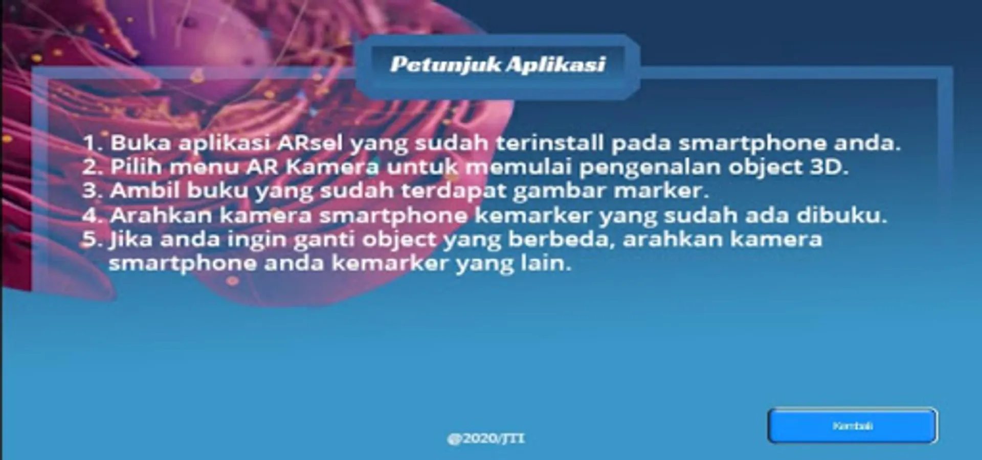 This application is an application that is used as a media for learning biology about cells using Augmented Reality. in this application there are materials and images of 3D cell structures along with parts. To bring up the cell structure, a marker is needed. The marker can be downloaded at the following link: