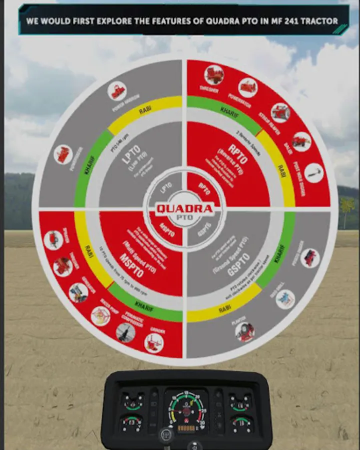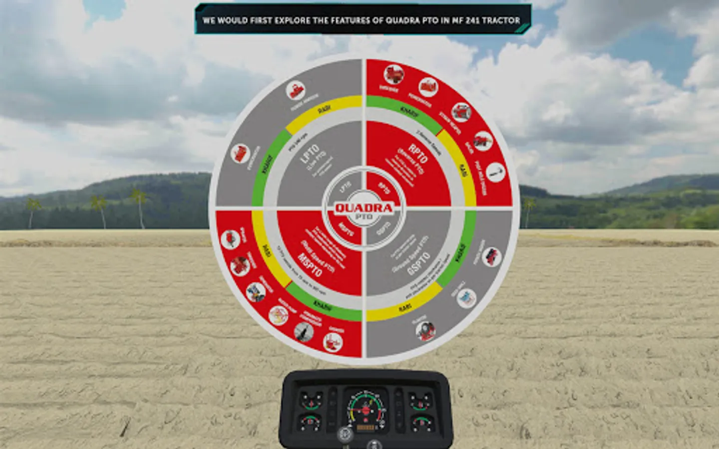 A virtual experience application to showcase the tractor MF 241 Eagle and its features such as Quadra PTO and Rototrac Transmission. This VR experience highlights the tractor's capabilities and its key advantages.