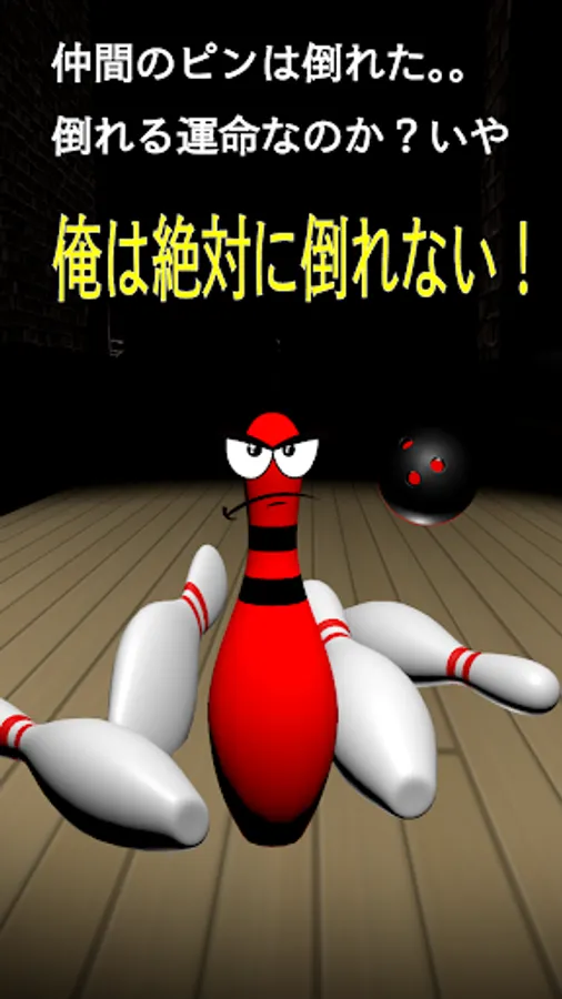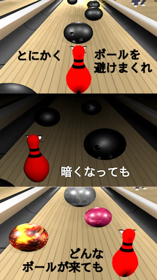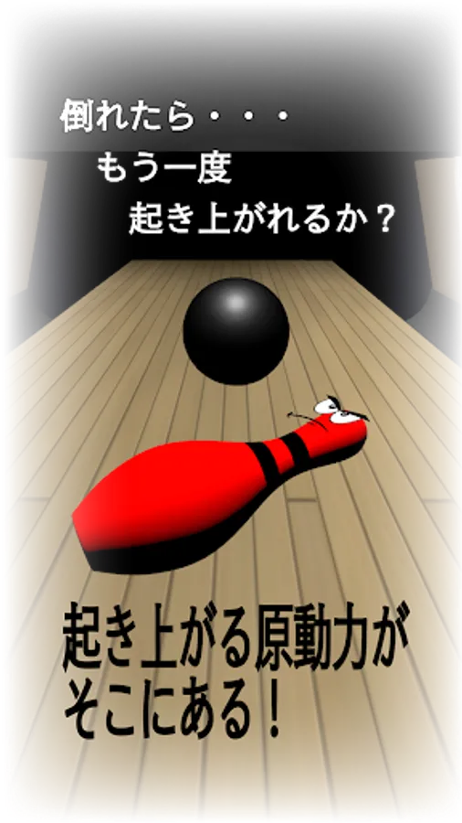 This app is a game where you control an indomitable bowling pin to dodge bowling balls from left and right. As you dodge more balls (score), the game level (difficulty) changes and the balls become faster/slower, the surroundings become darker, the balls start curving, and various types of balls start rolling towards you. Based on your score, you can obtain positive words (phrases) from the bowling pin. Stand up multiple times, dodge many balls, and aim for completing positive words!