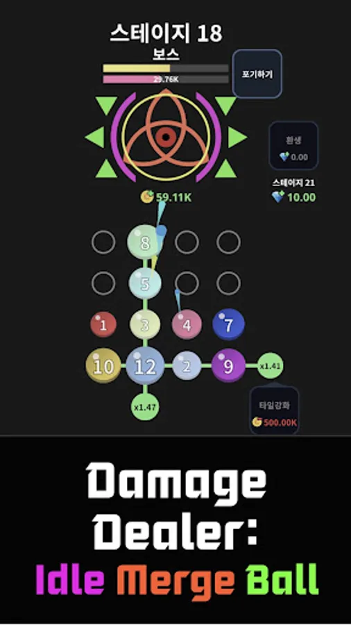"Damage Dealer: Idle Merge Ball" is a game that requires participation and selective thinking beyond simply being idle. Combine balls to create more powerful damage and strengthen tiles to defeat monsters. By watching advertisements for additional rewards and utilizing various elements within the game, you can smoothly advance through the stages.