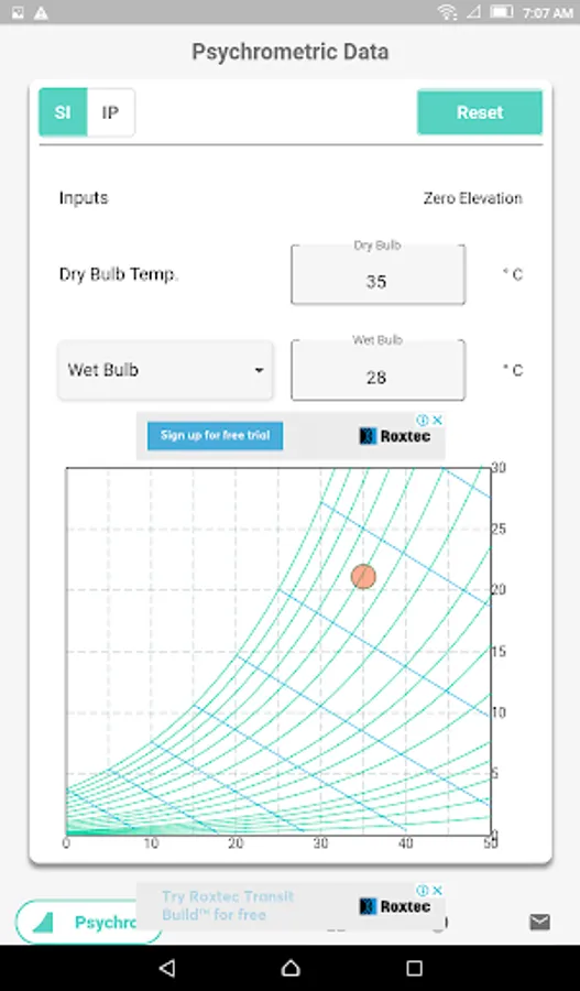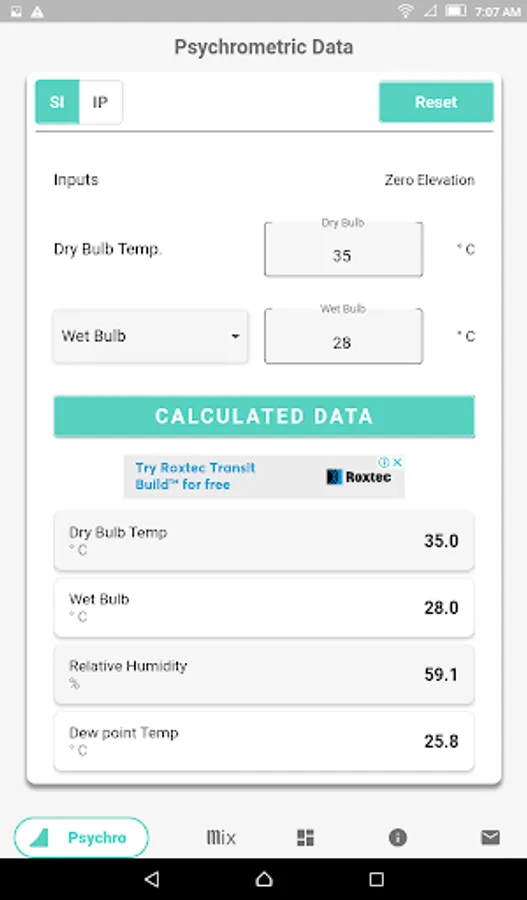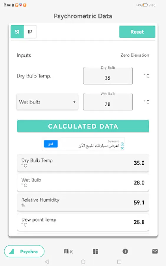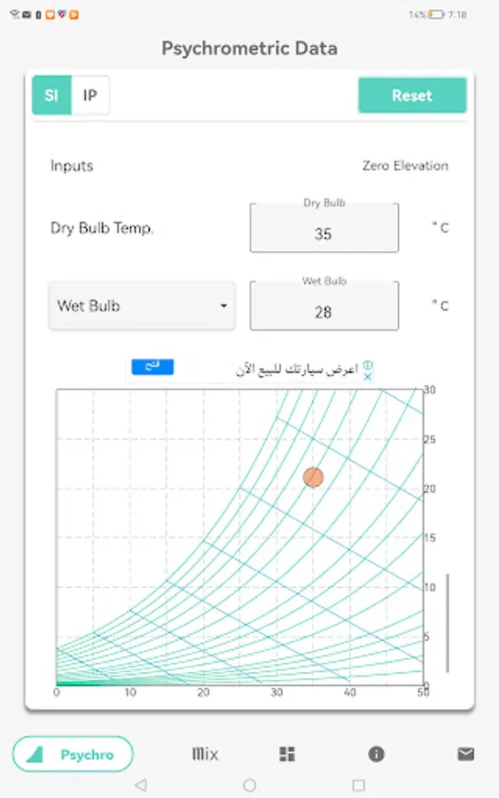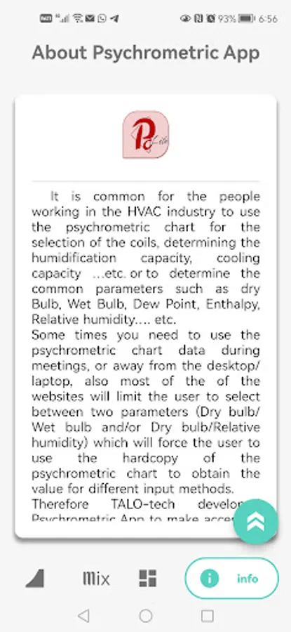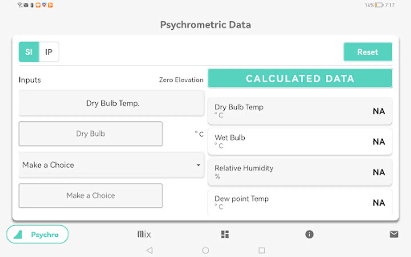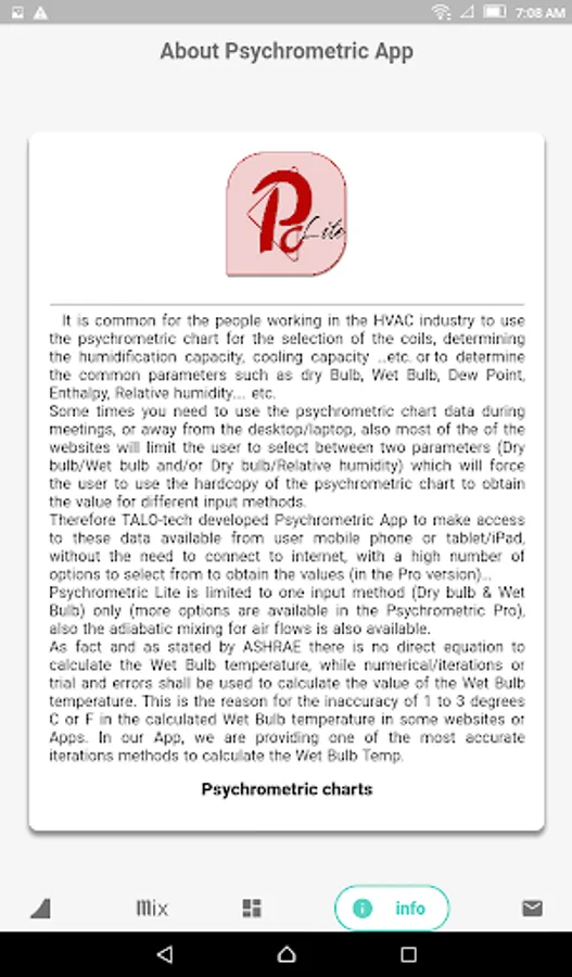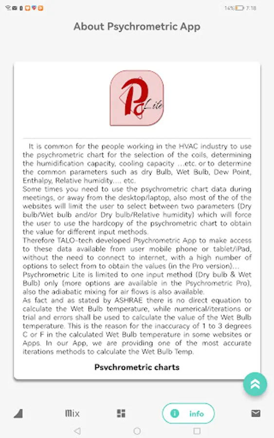 Psychrometric Lite is basically a lite version from Psychrometric Pro targeting mechanical engineers, Designers, HVAC equipment suppliers,...etc. will allow them to calculate the air properties used in the HVAC industry (used mainly for HVAC equipment selections, coil sizing,...etc.) by entering 2 inputs of air parameters only these inputs in the Lite version are the Dry Bulb & the Wet Bulb temperatures only.