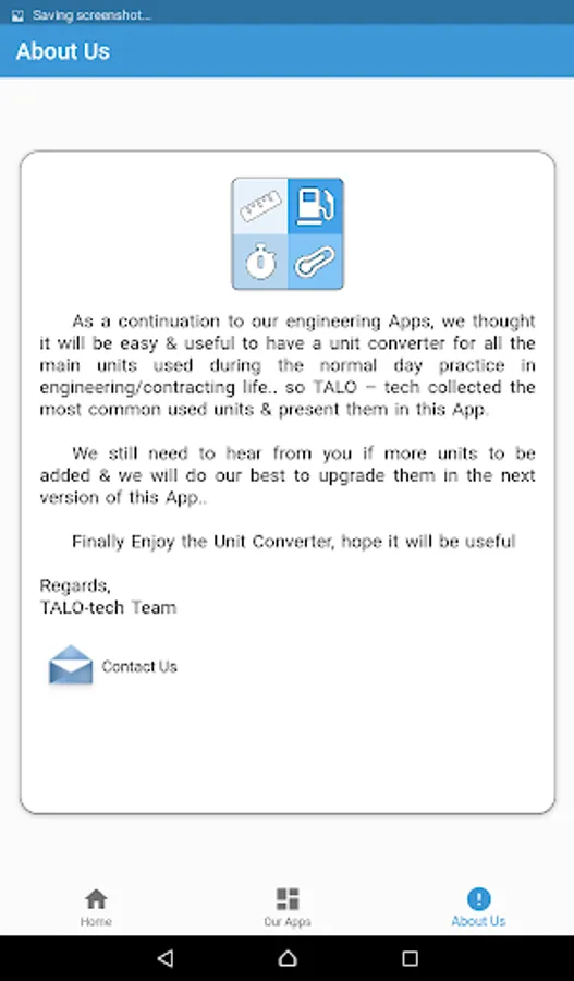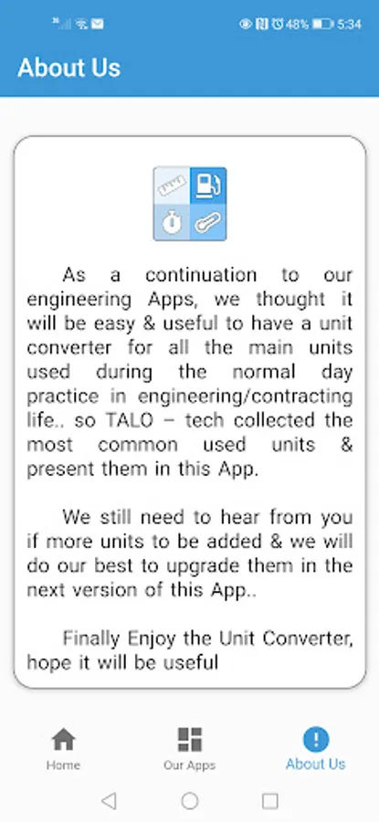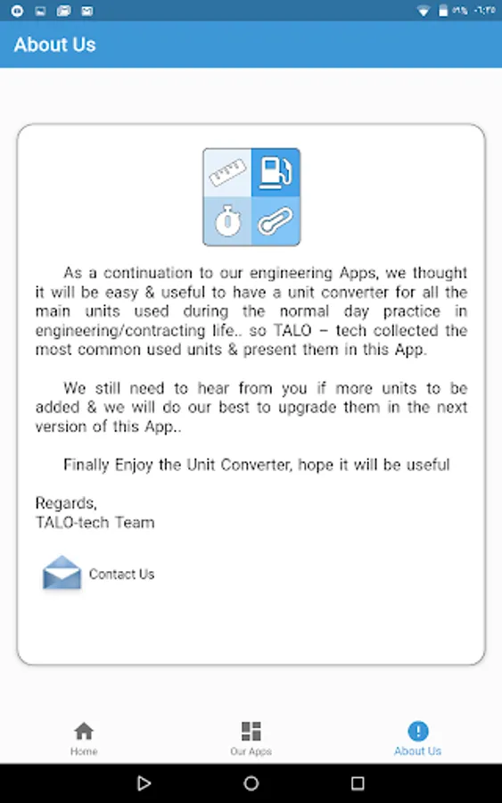 As a continuation to our engineering Apps, we thought it will be easy & useful to have a unit converter for all the main units used during the normal day practice in engineering/contracting life.. so TALO – tech collected the most common used units & present them in this App.