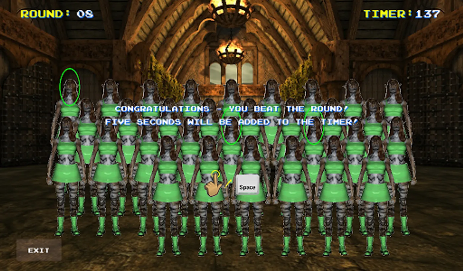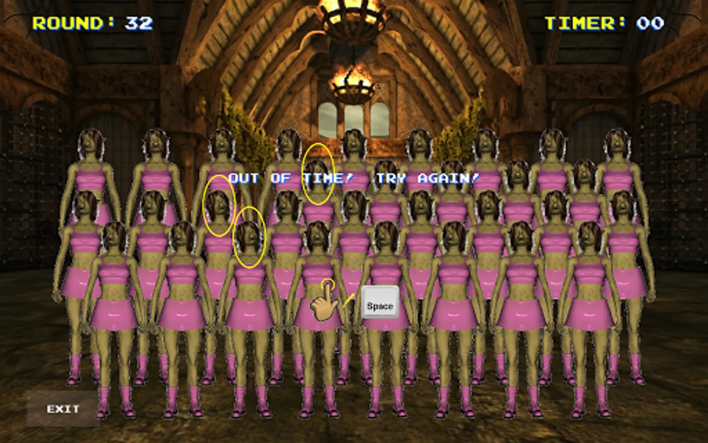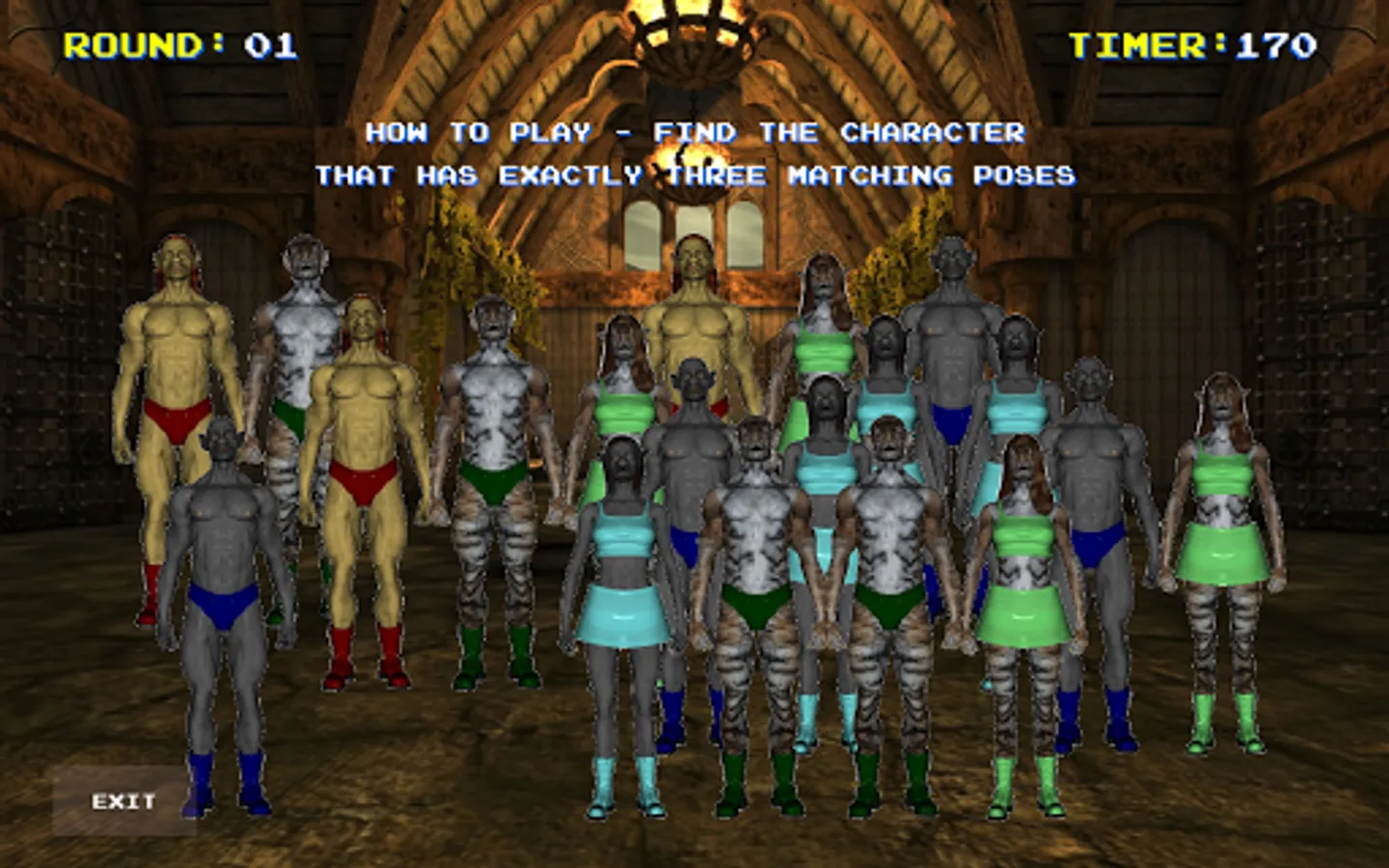 The object of this game is easy enough. Find the character on screen shown in a matching pose three (and only three) times. Choose correctly to get 5 seconds (or 10 seconds in later rounds) added to the timer before the next round. But watch out... if you choose incorrectly, 5 seconds will be subtracted from the timer before the next round. Run out of time, and it's Game Over. Simple, but fun!