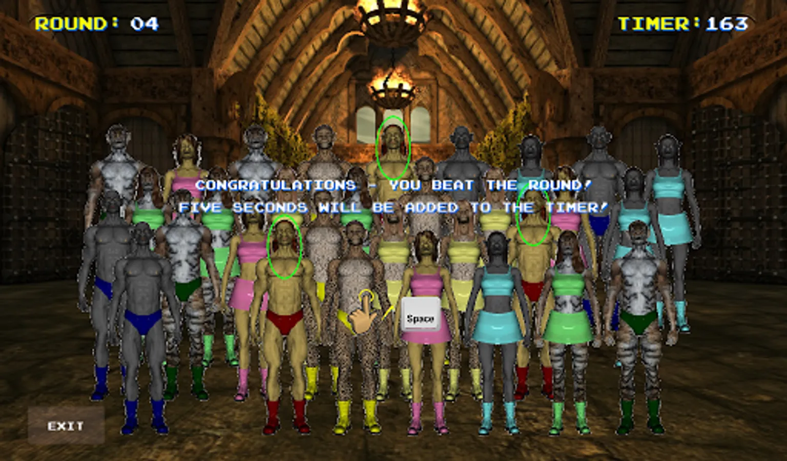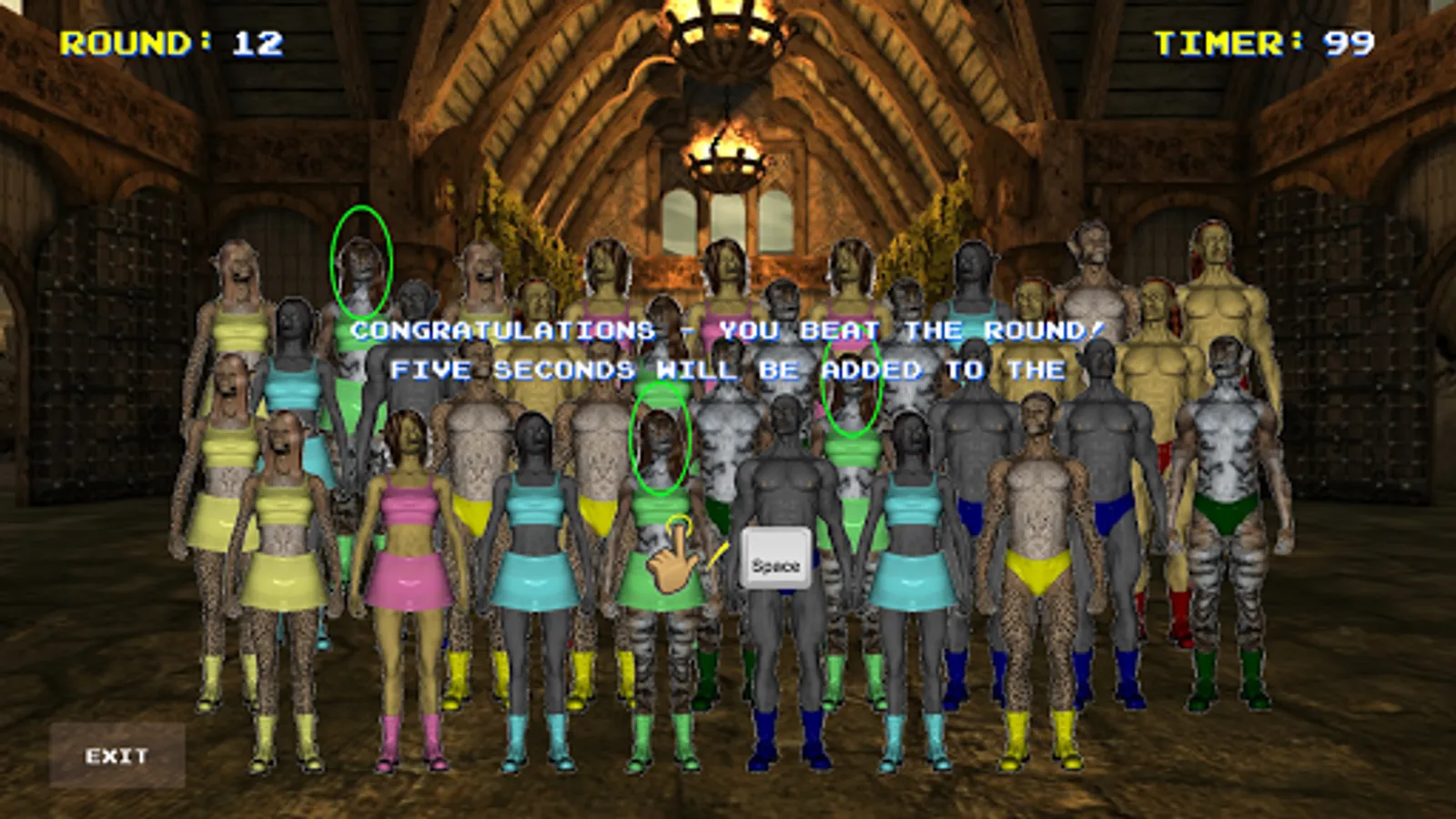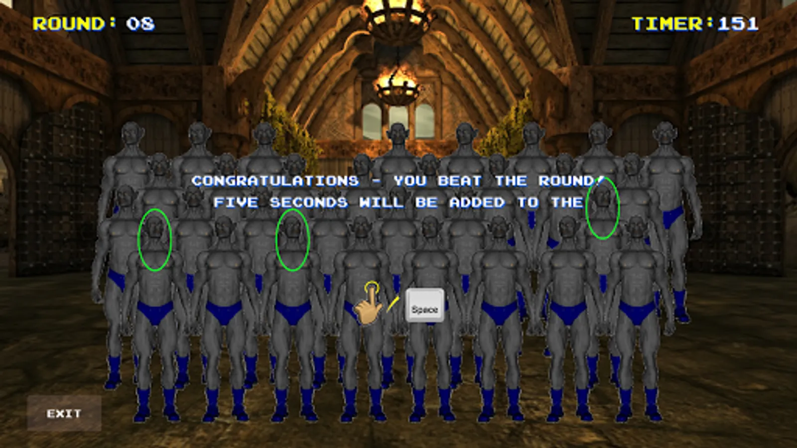 The object of this game is easy enough. Find the character on screen shown in a matching pose three (and only three) times. Choose correctly to get 5 seconds (or 10 seconds in later rounds) added to the timer before the next round. But watch out... if you choose incorrectly, 5 seconds will be subtracted from the timer before the next round. Run out of time, and it's Game Over. Simple, but fun!