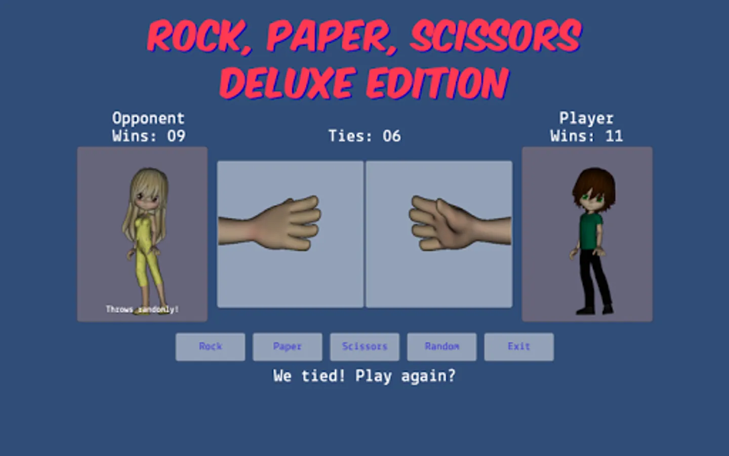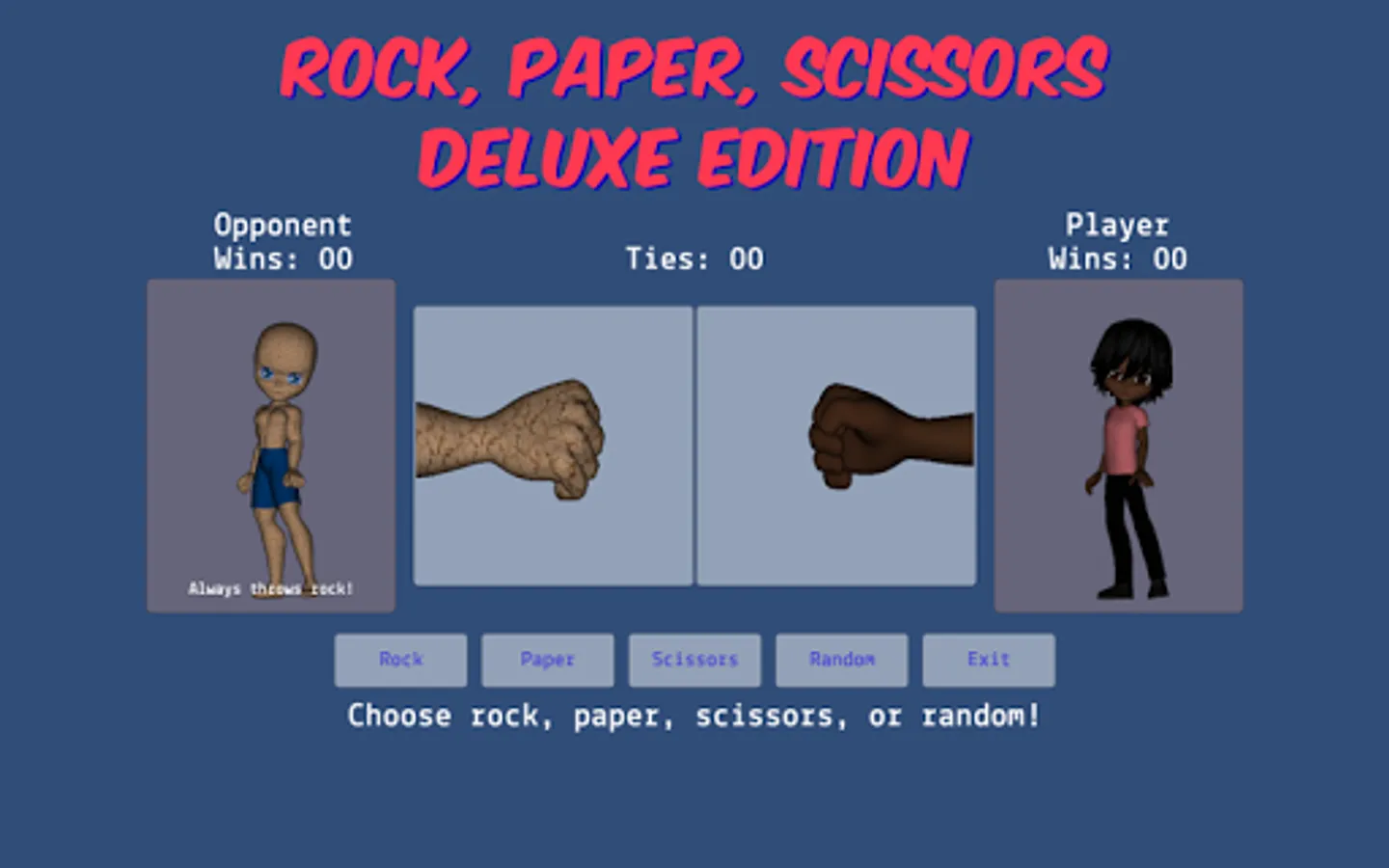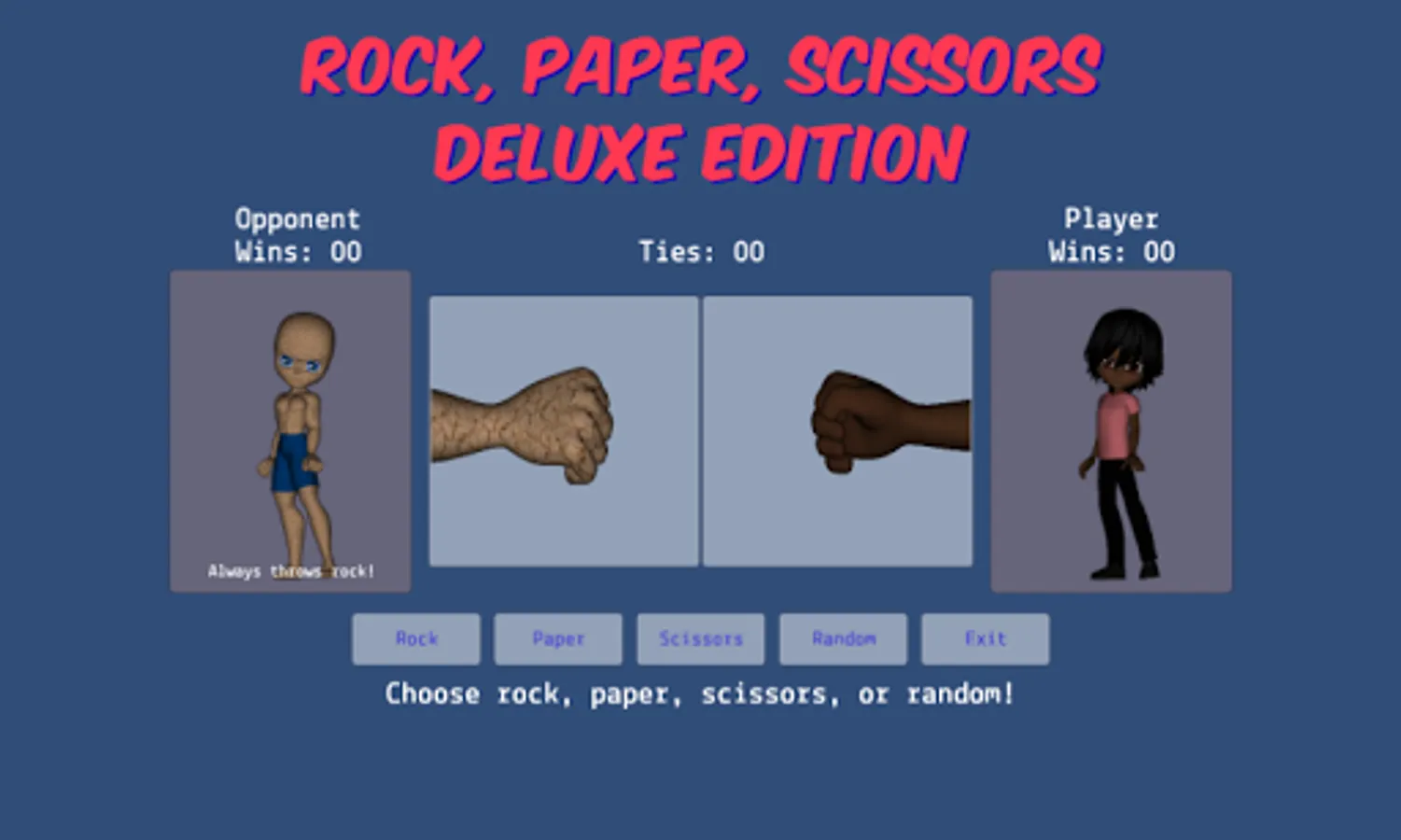 - allows the player to choose rock, paper, scissors, or random during gameplay