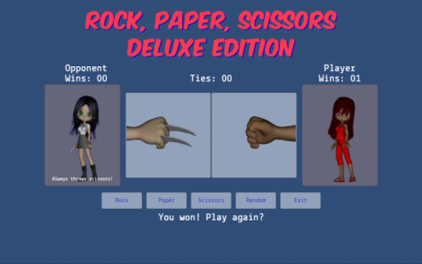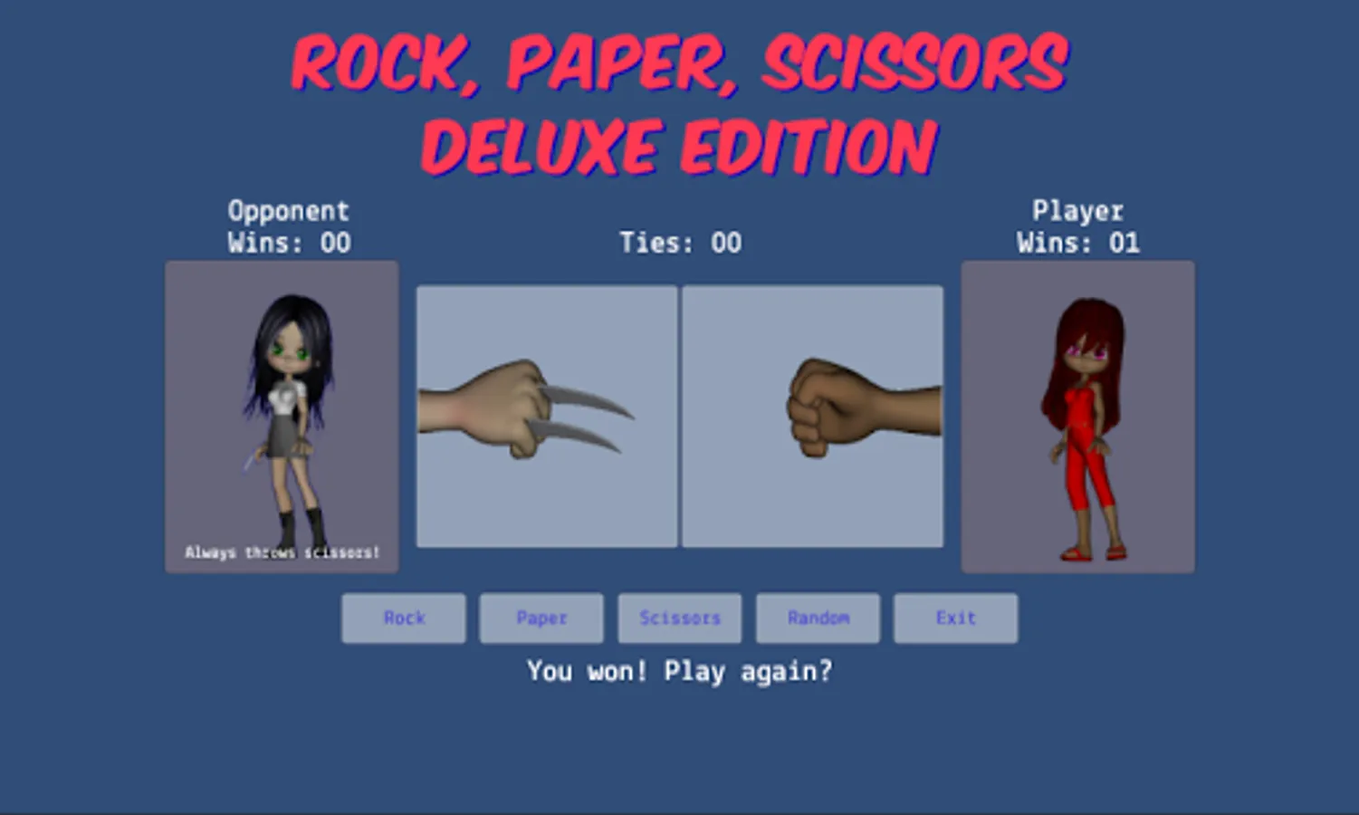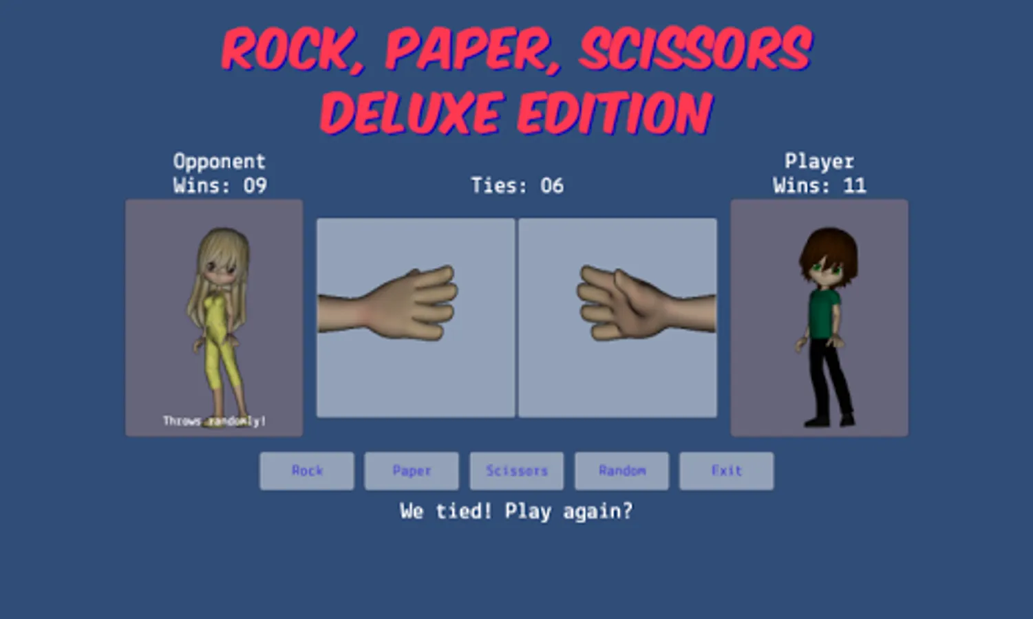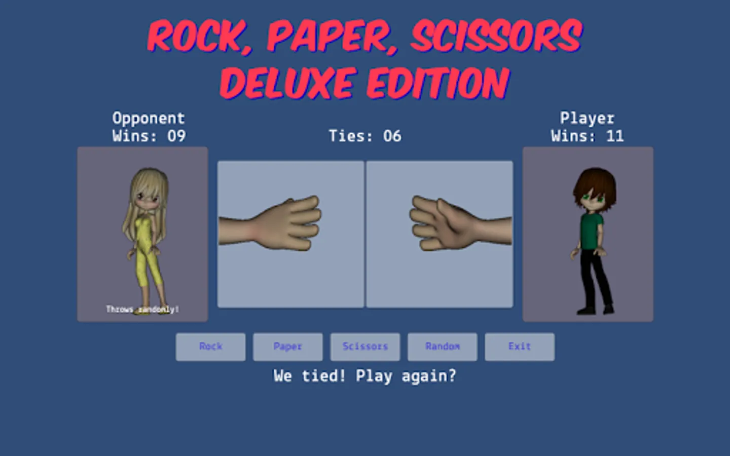 - allows the player to choose rock, paper, scissors, or random during gameplay