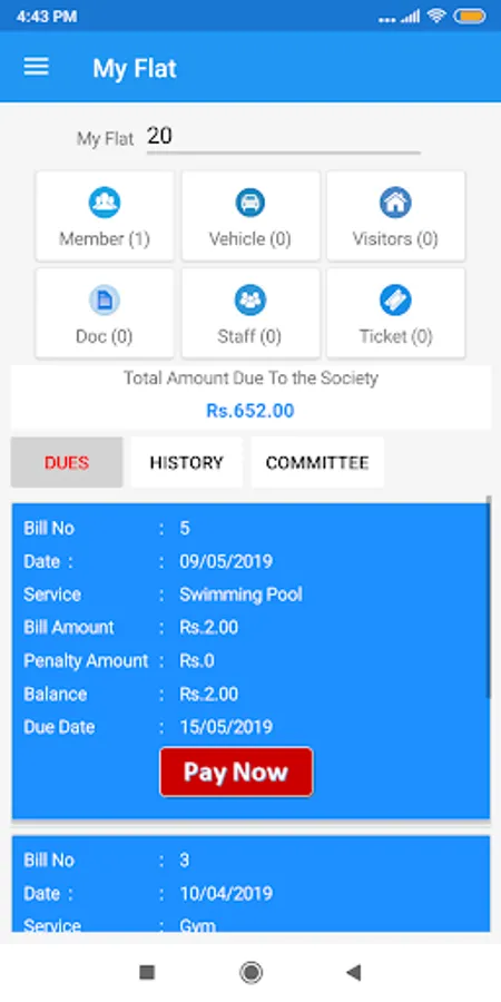 Simplified Billing and payment of Society dues through app and web portal login. Say good-bye to Paper records with payment history and account maintenance