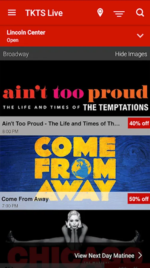 TKTS offers same-day tickets to Broadway and Off Broadway shows at discounts of up to 50% off full price. The Official TKTS app is directly linked to the display boards at the TKTS Discount Booths, so what you're seeing is exactly what the people waiting in line are seeing. The listings update in real time so you’ll have a completely up-to-date list of available shows right in the palm of your hand.