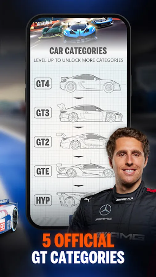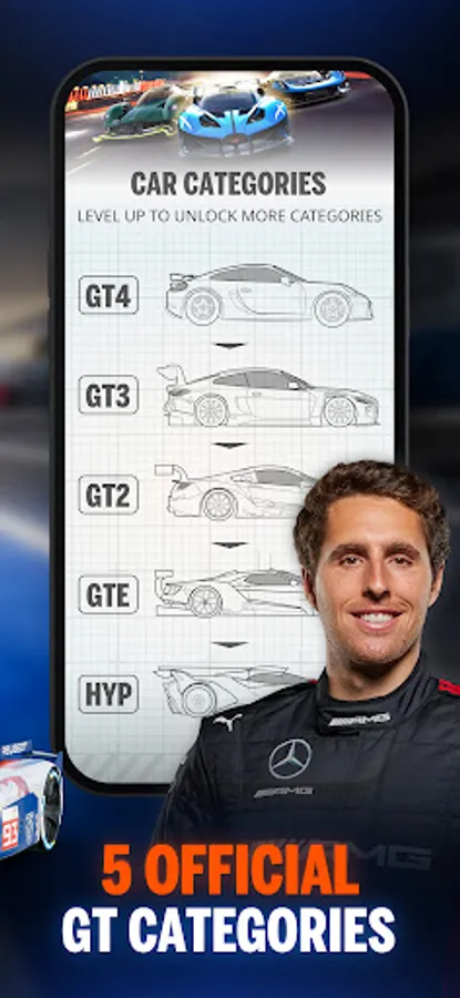 Acquire cars from the official FIA GT4, GT3, GT2 and GTE categories like Porsche, Mercedes, McLaren, Nissan, or BMW cars. Take your team to the next level and reach the HYPERCAR category featuring the Aston Martin Valkyrie AMR Pro, the Bugatti Bolide and the Peugeot 9X8!