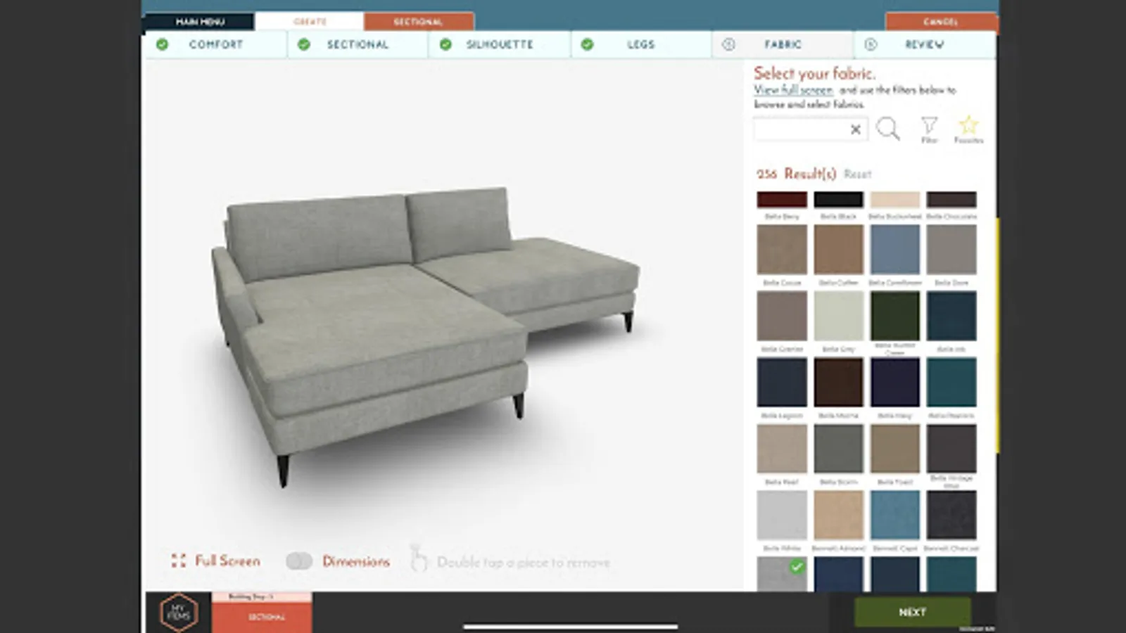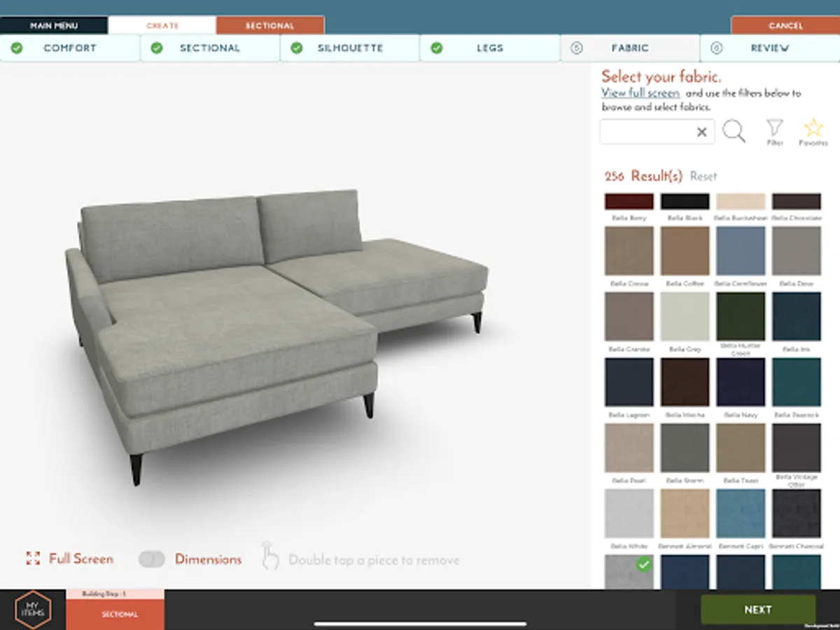 You’ll love the app’s fun and easy 3D rendering technology, which allows you to admire your new creation at every angle with 360° and bird’s eye views. Exact measurements will guide you in making sure your piece flows (and fits!) within your space.