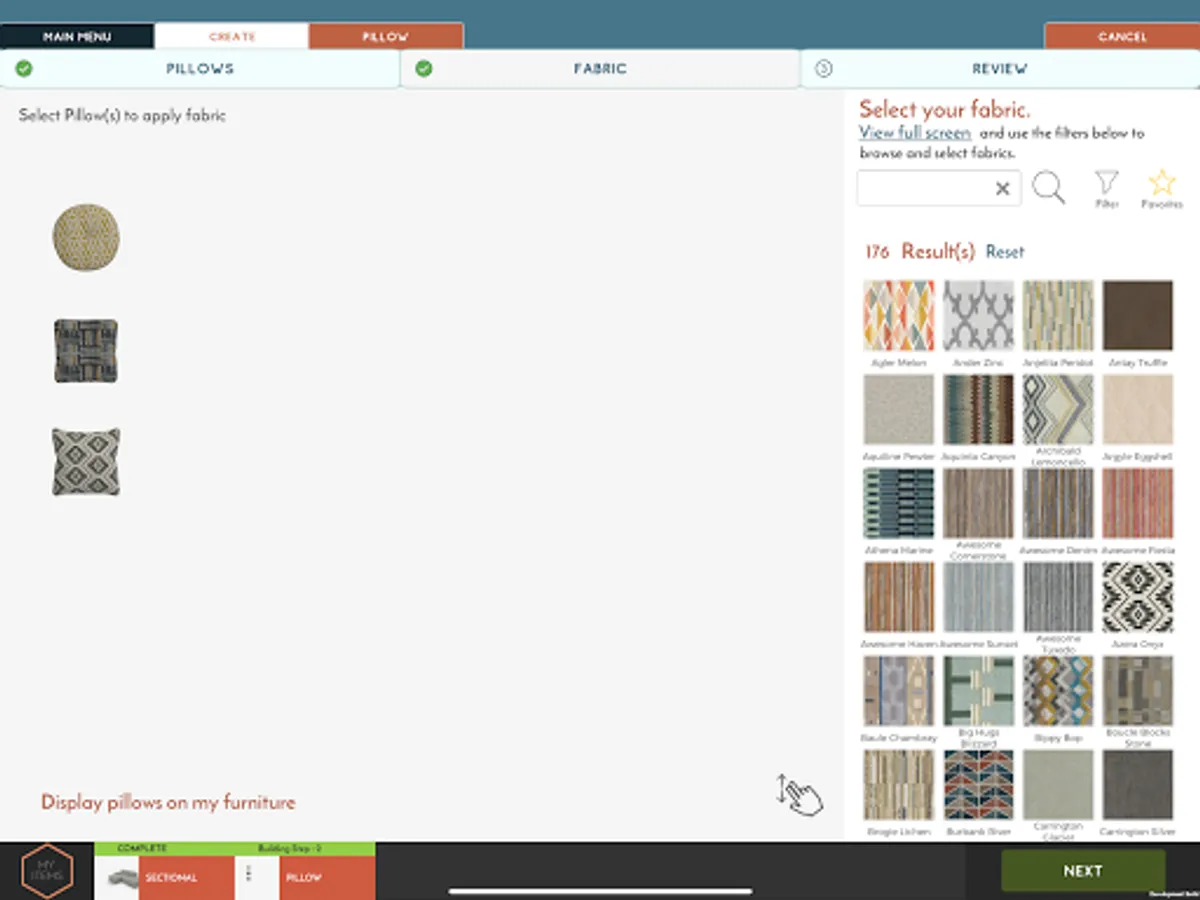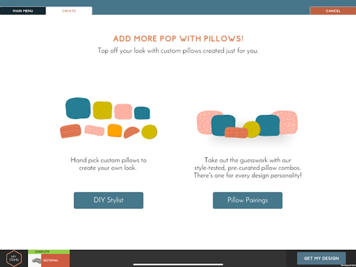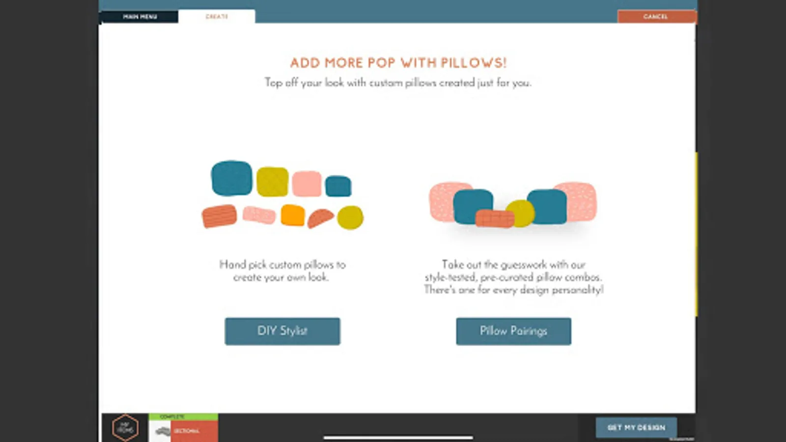 Once you’ve created your sofa or sectional, accessorize away with Sofa POP, an irresistible collection of must-have accent pieces – chairs, ottomans and pillows – which pair perfectly with your new furniture to make your entire room pop. You can even layer pillows onto your furniture with a simple tap to visualize your whole look. Obsessed.