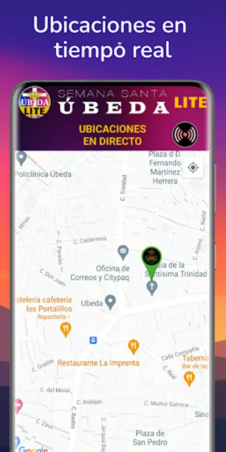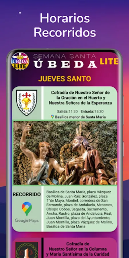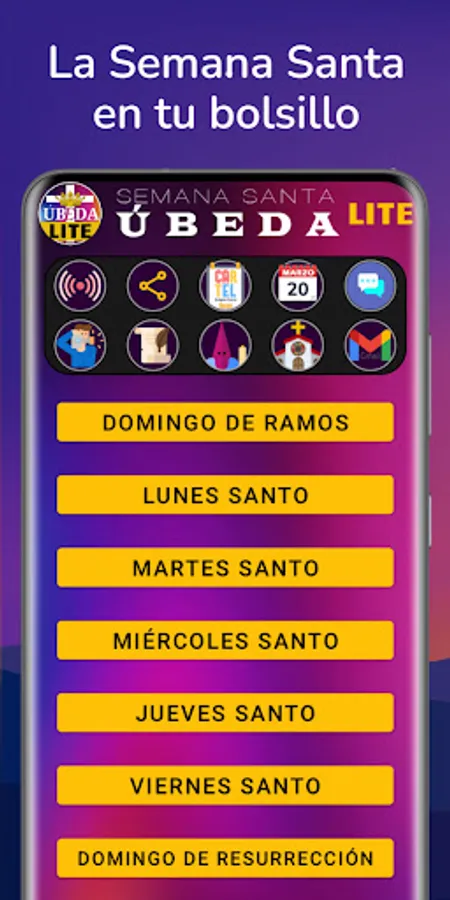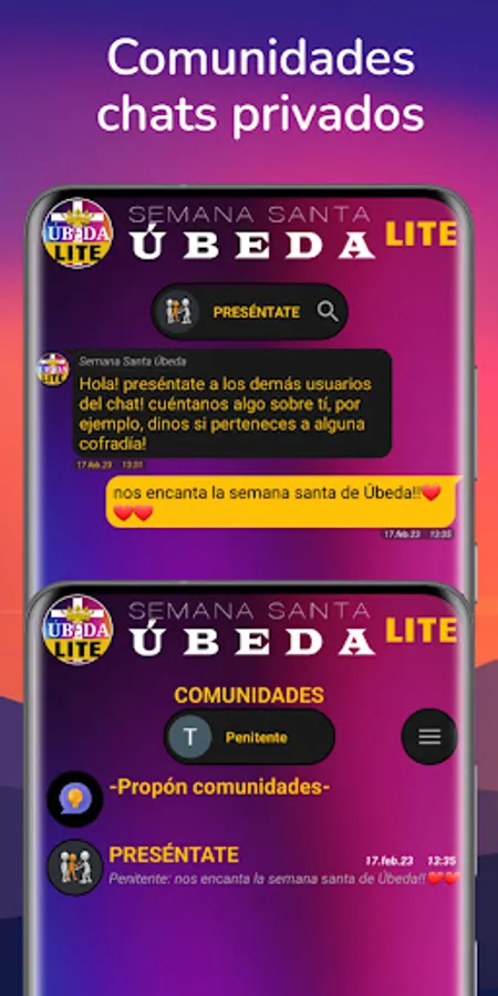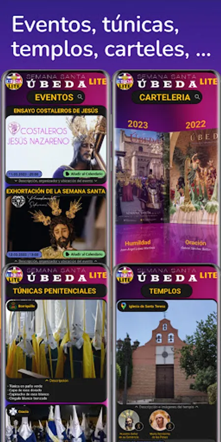 Various sections such as events (with the possibility of saving it in the device's calendar), penitential robes, temples, chat (communities and private) and real-time locations of processions and stations of the cross.