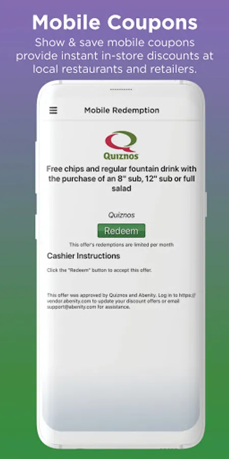 Show & save mobile coupons provide instant in-store discounts at nearby restaurants and retailers.