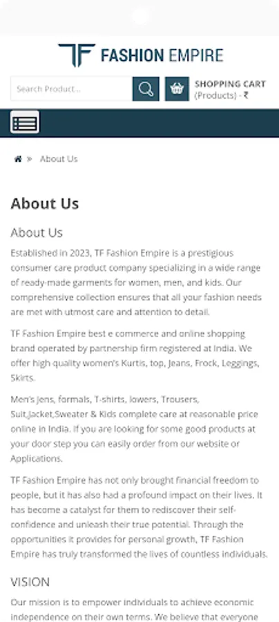 TF Fashion Empire best e commerce and online shopping brand operated by partnership firm registered at India. We offer high quality women’s Kurtis, top, Jeans, Frock, Leggings, Skirts.