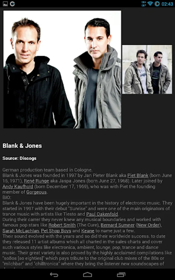 * Show artist / album information with links to facebook, twitter, youtube videos when available.