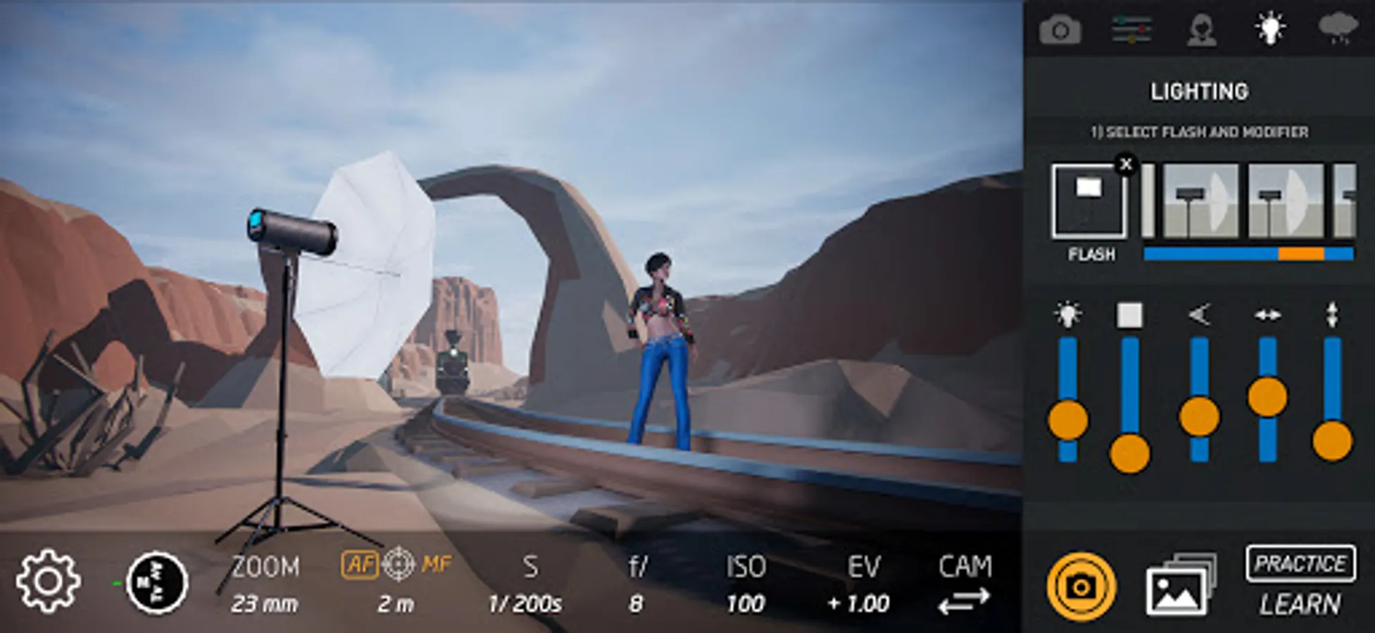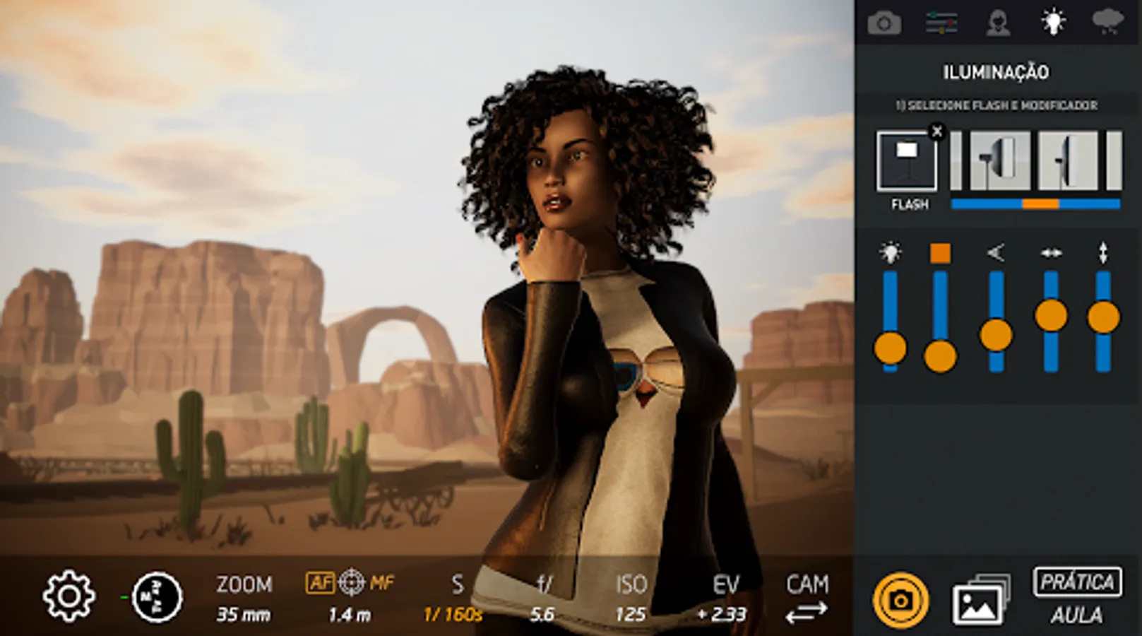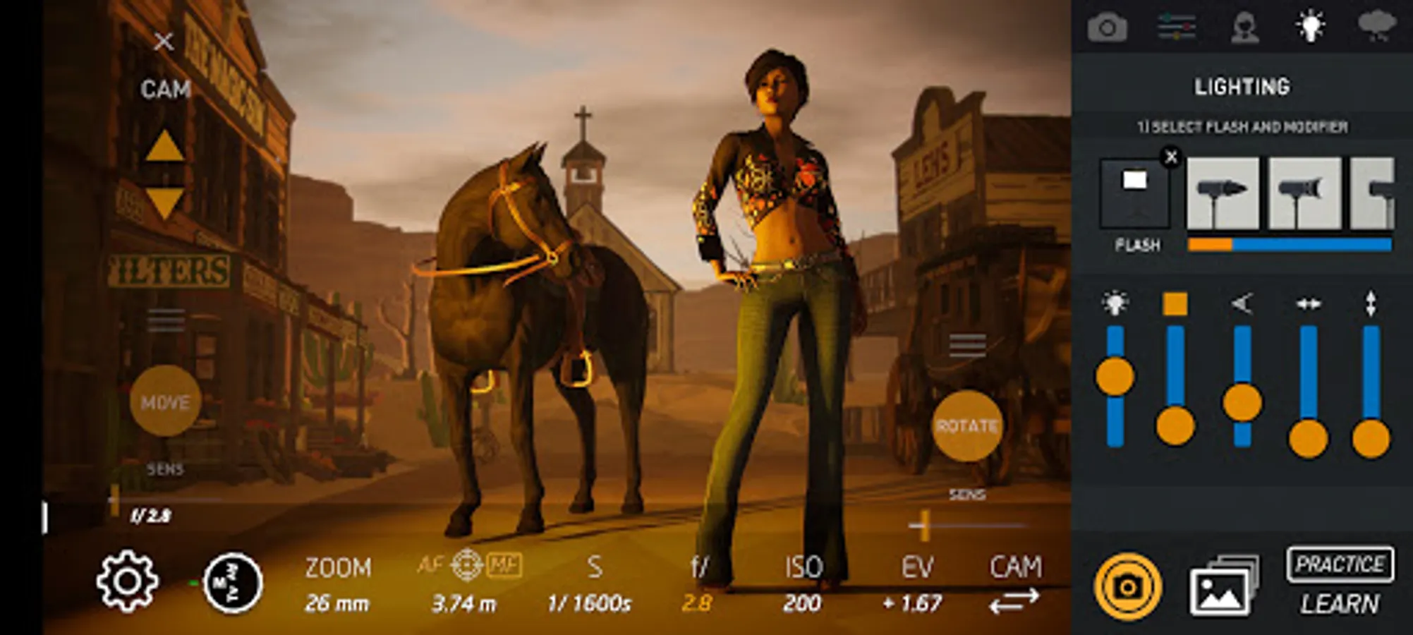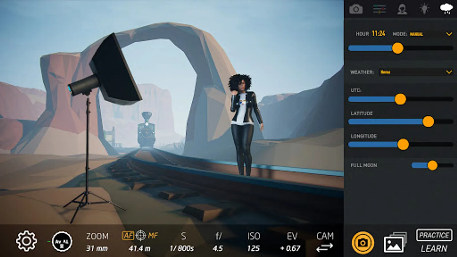 The features of the simulator will help you practice a ton of photography techniques such as lens and cameras characteristics, composition, framing, natural light photography, off camera flash, outdoors and indoor photography, landscape, portraits, creative lighting and much more.