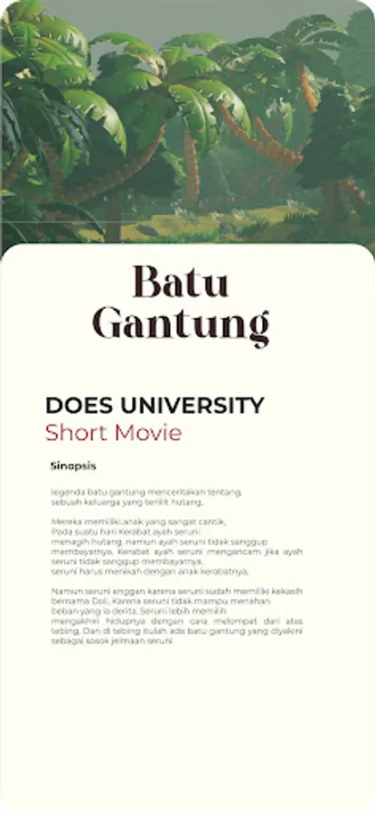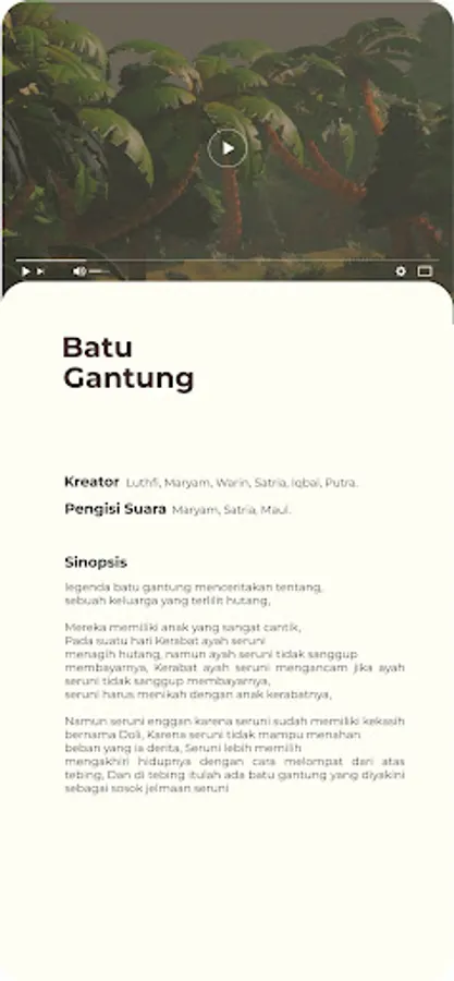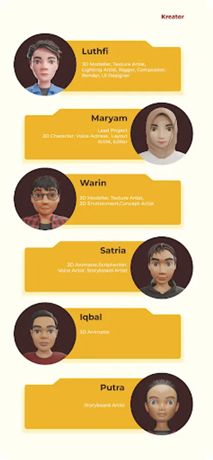 Technology is really opening new doors, di aplikasi ini kamu bisa berkenalan dengan creator team cerita rakyat sekaligus jobdesk mereka. Kamu juga bisa menonton video pre-release cerita rakyat yang kamu pilih dengan kualitas HD dan bermain dengan karakter / tokoh dalam cerita rakyat tersebut dengan nyata
