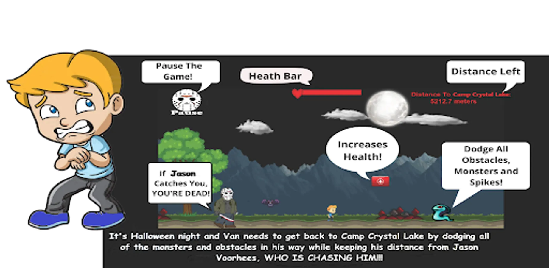 Help Van get back to Camp Crystal Lake safely by dodging obstacles and grabbing the odd health pack while being chased by this ruthless killer.
