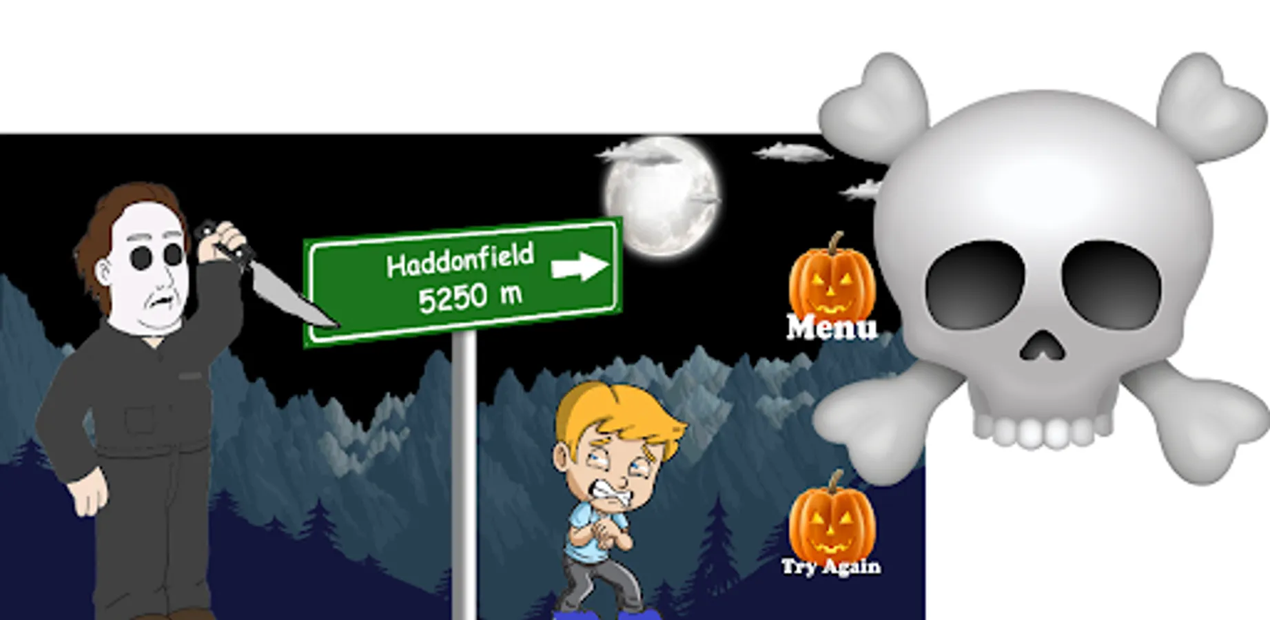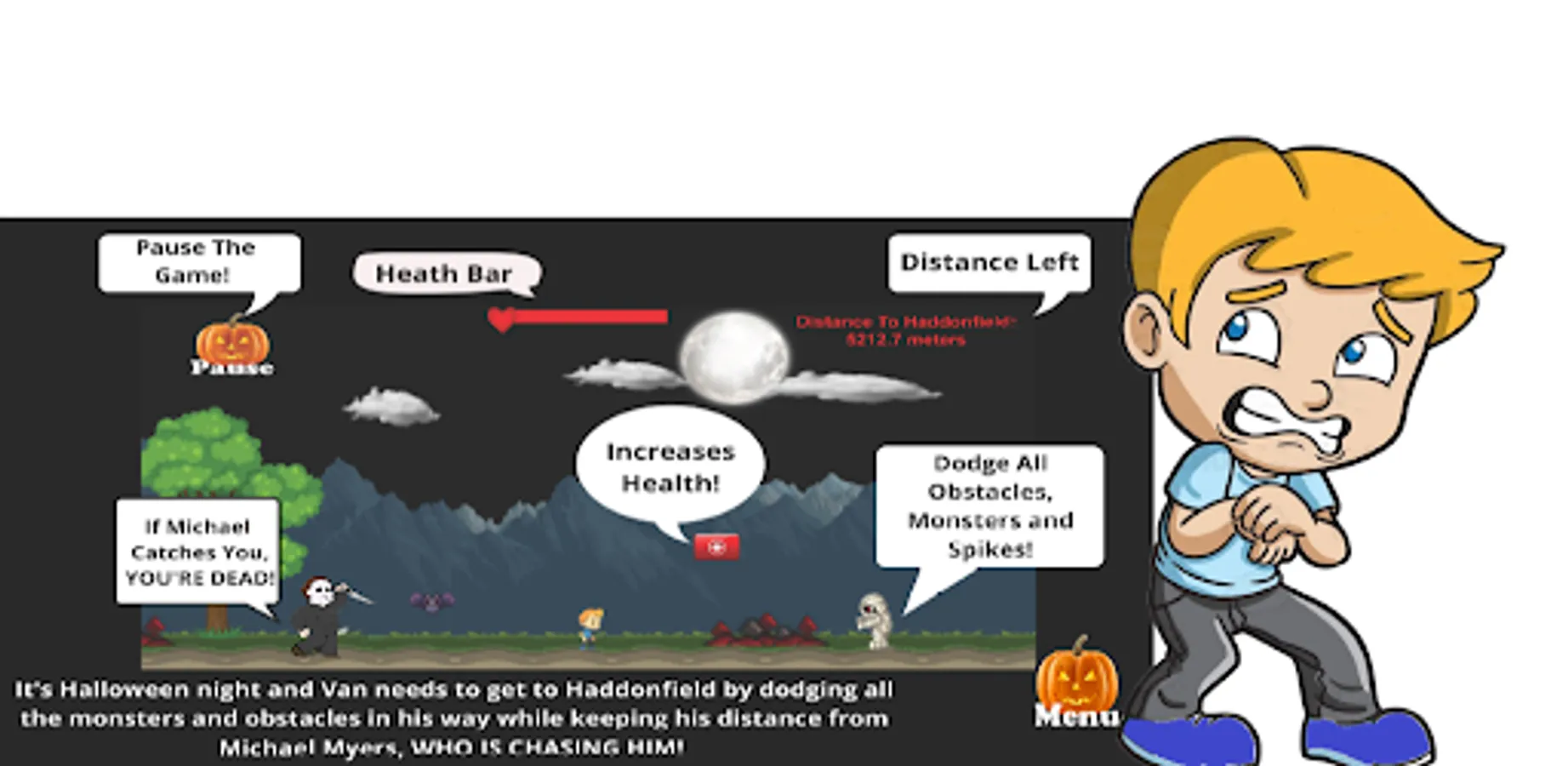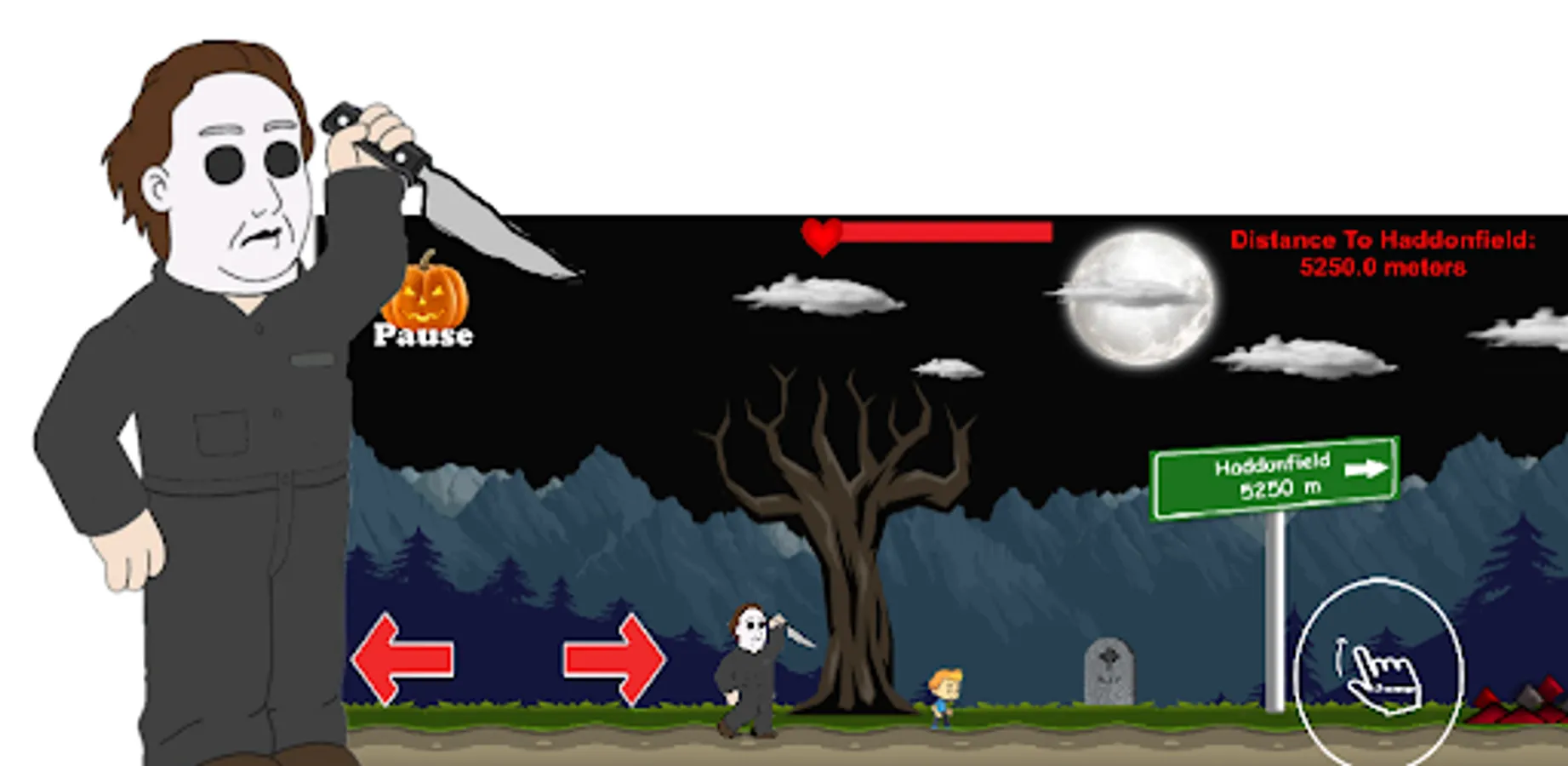 Help Van get back to Haddonfield safely by dodging obstacles and grabbing the odd health pack while being chased by this ruthless killer.