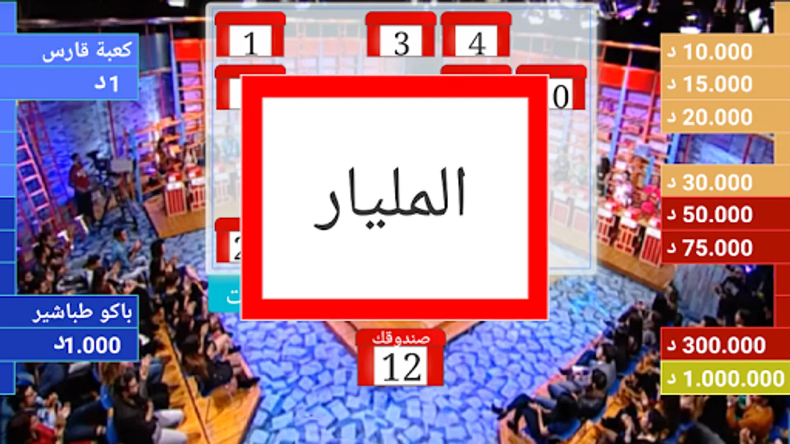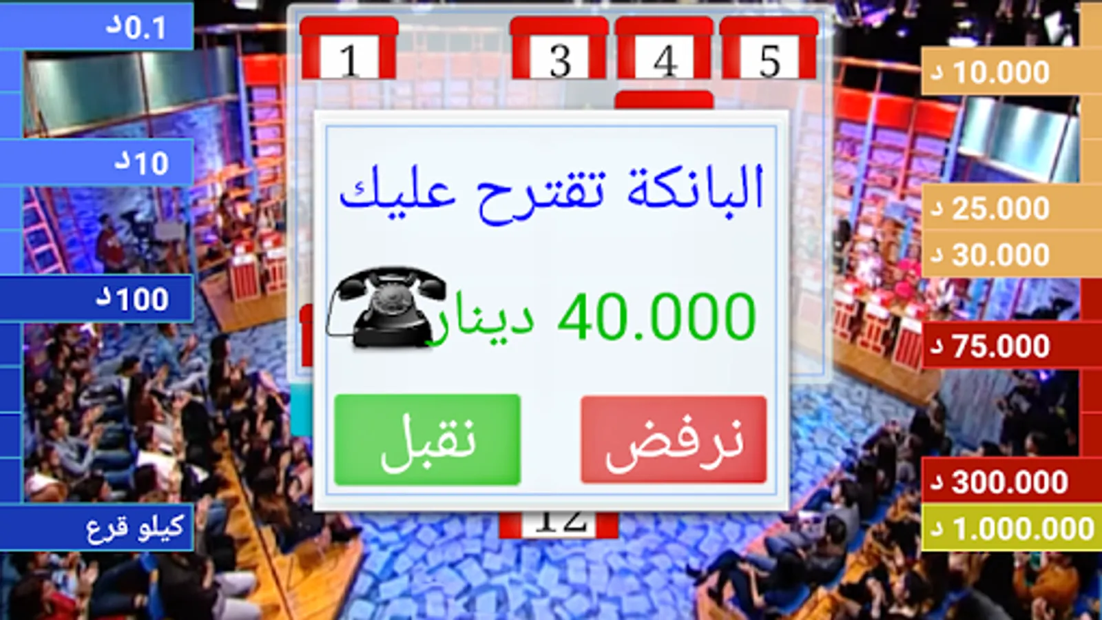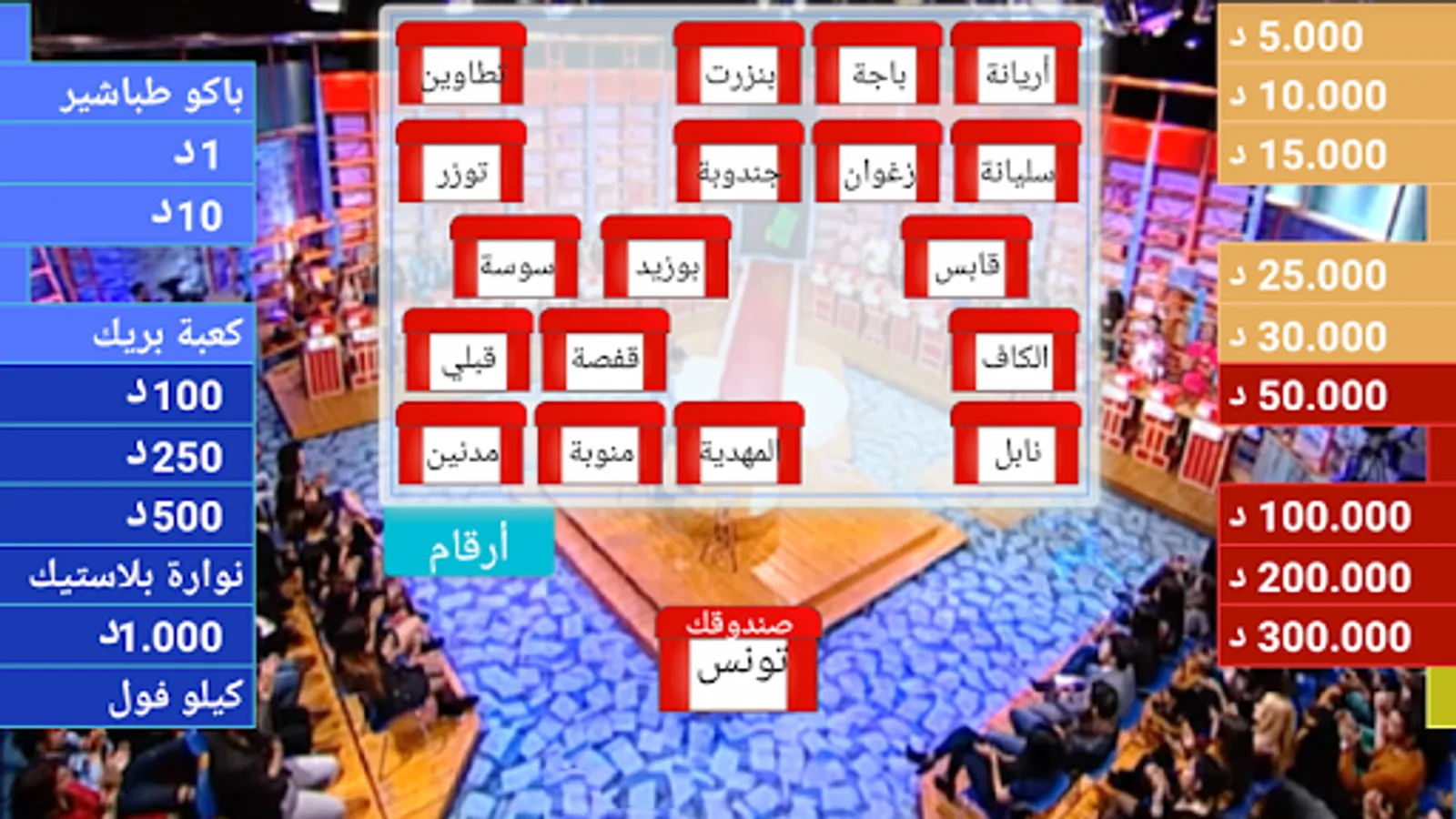 The principle of the game Dlilek mlak each player has a box (Sandouk) which contains a determined amount of money (up to a billion Tunisian millimes) or objects. At the start of the game Dlilek Mlak the player chooses his box then eliminates the other boxes one by one, and regularly receives calls from the banker who offers him a determined sum or the exchange of his box for another