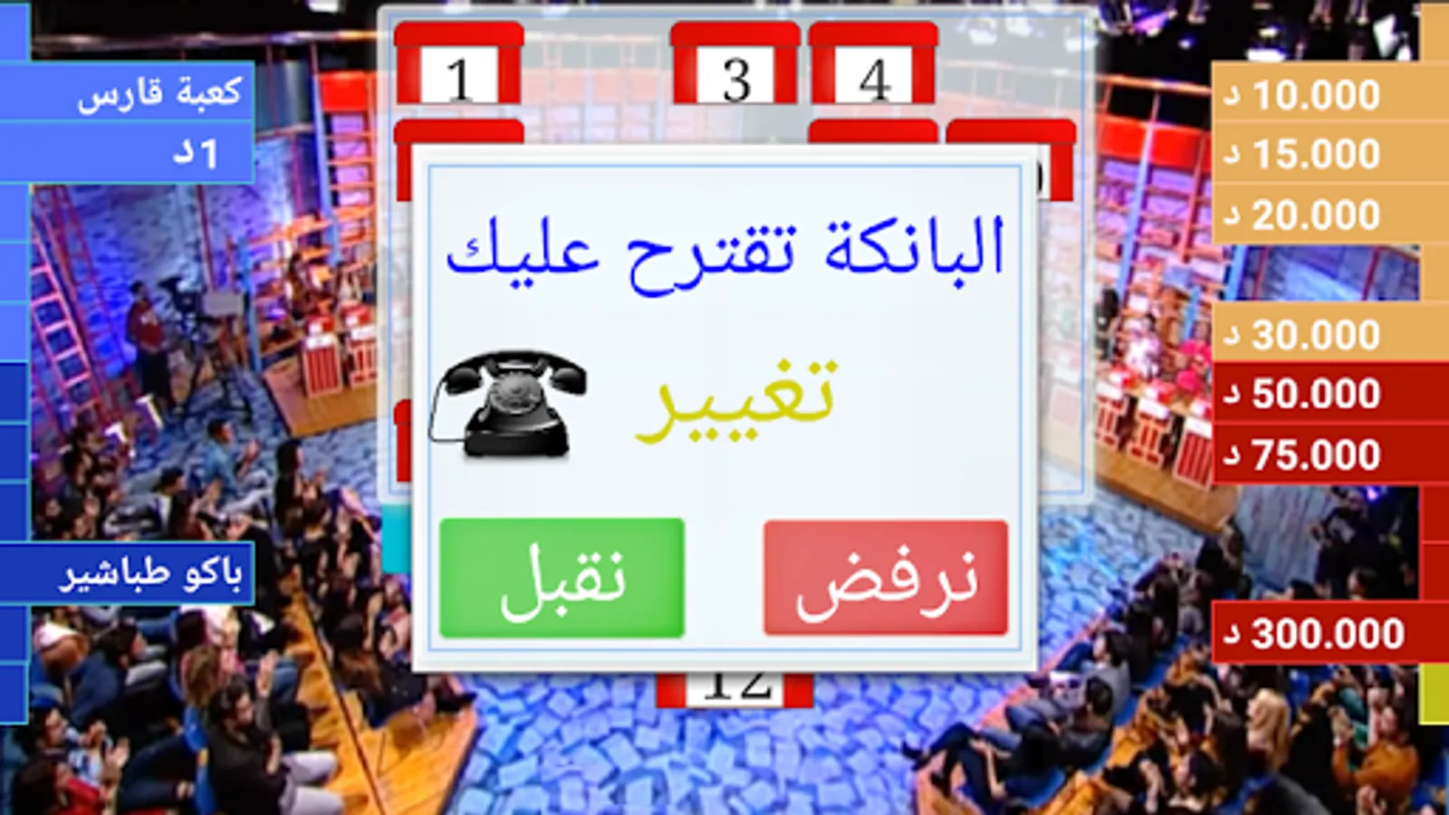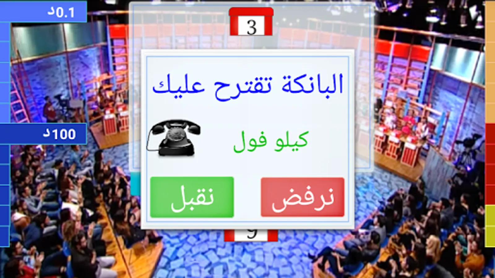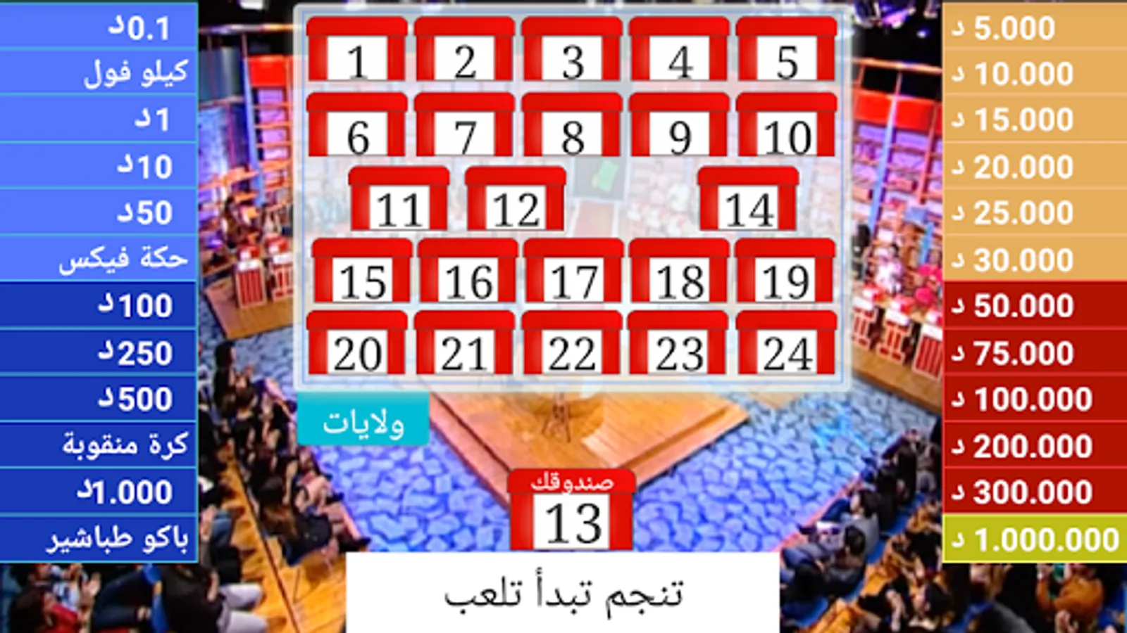The principle of the game Dlilek mlak each player has a box (Sandouk) which contains a determined amount of money (up to a billion Tunisian millimes) or objects. At the start of the game Dlilek Mlak the player chooses his box then eliminates the other boxes one by one, and regularly receives calls from the banker who offers him a determined sum or the exchange of his box for another