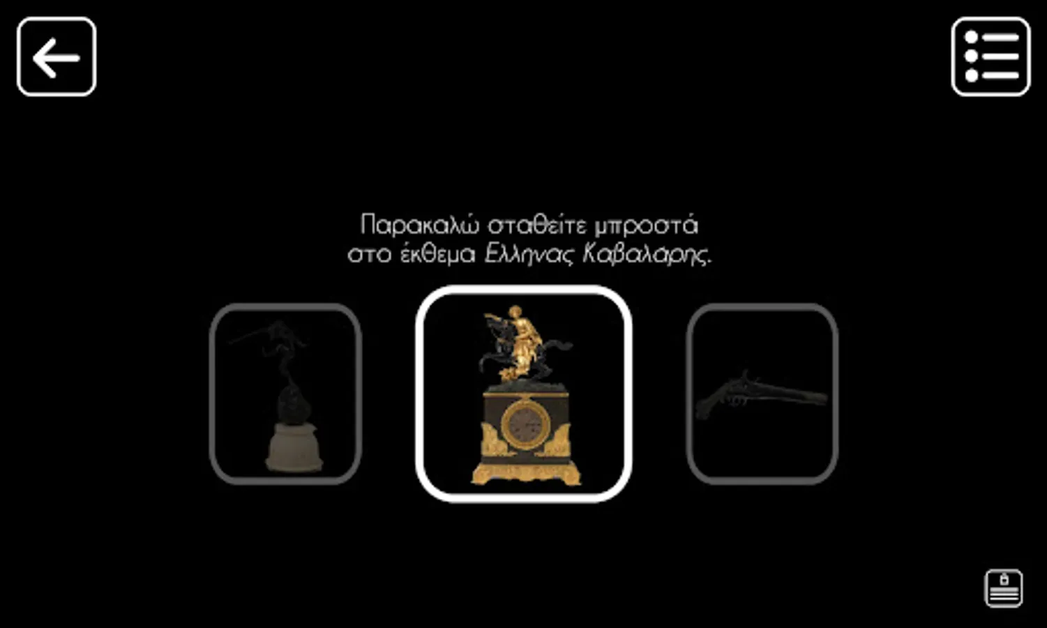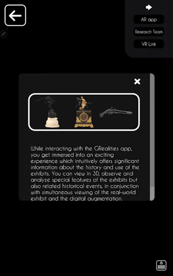 Augmented Reality application for the digital augmentation (3D animation, video) of three 3 physical artifacts which are part of the current exhibition hosted at the Municipal Art Gallery of Chania, Crete. Greece, from October 30, 2021 - March 30, 2022, titled "Greece after the revolution - Artistic treasures from the Krasaki collection".