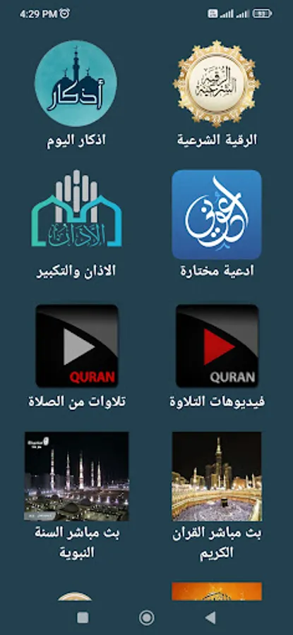 Selected supplications - the call to prayer and the takbir - video recitations - recitations from the prayer - a live broadcast of the Noble Qur’an - a live broadcast of the Sunnah of the Prophet