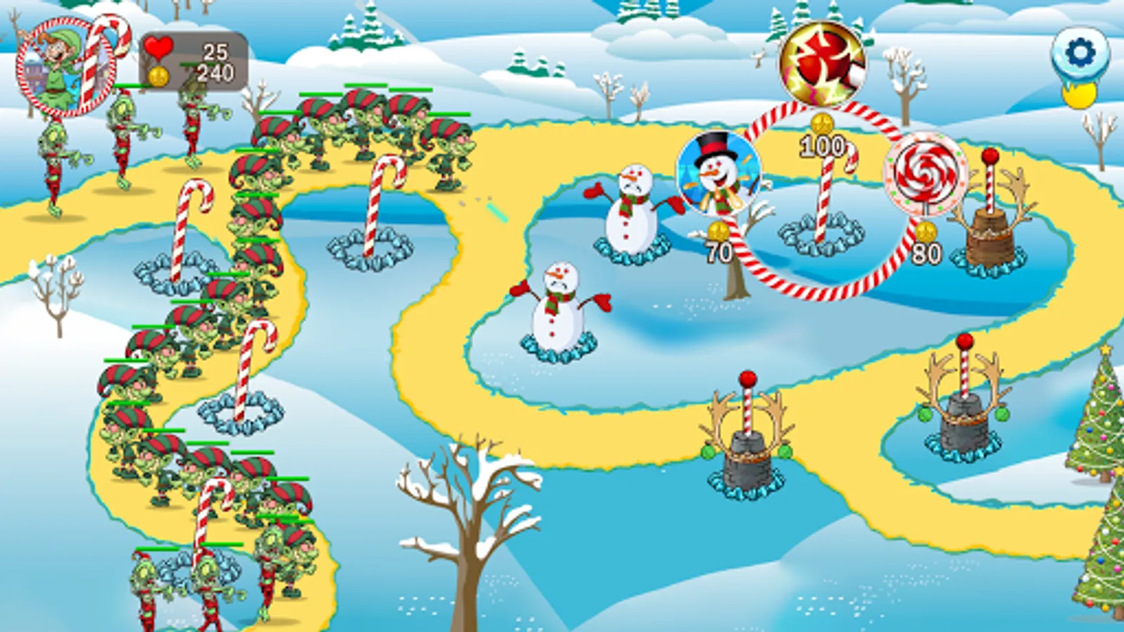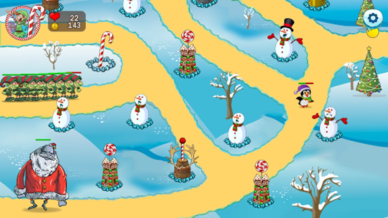 9 animated enemies ravaging their way through the North Pole trying to bypass your tower defense