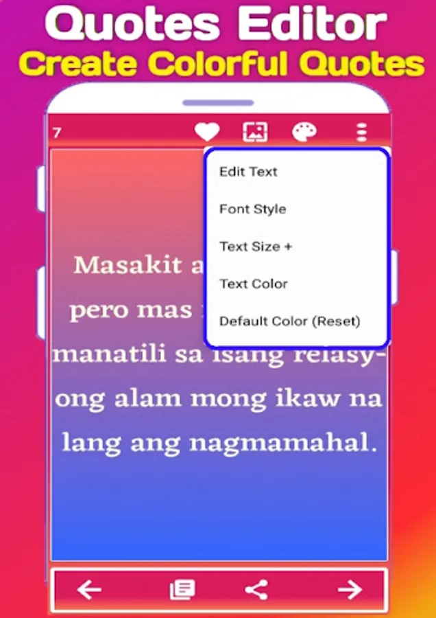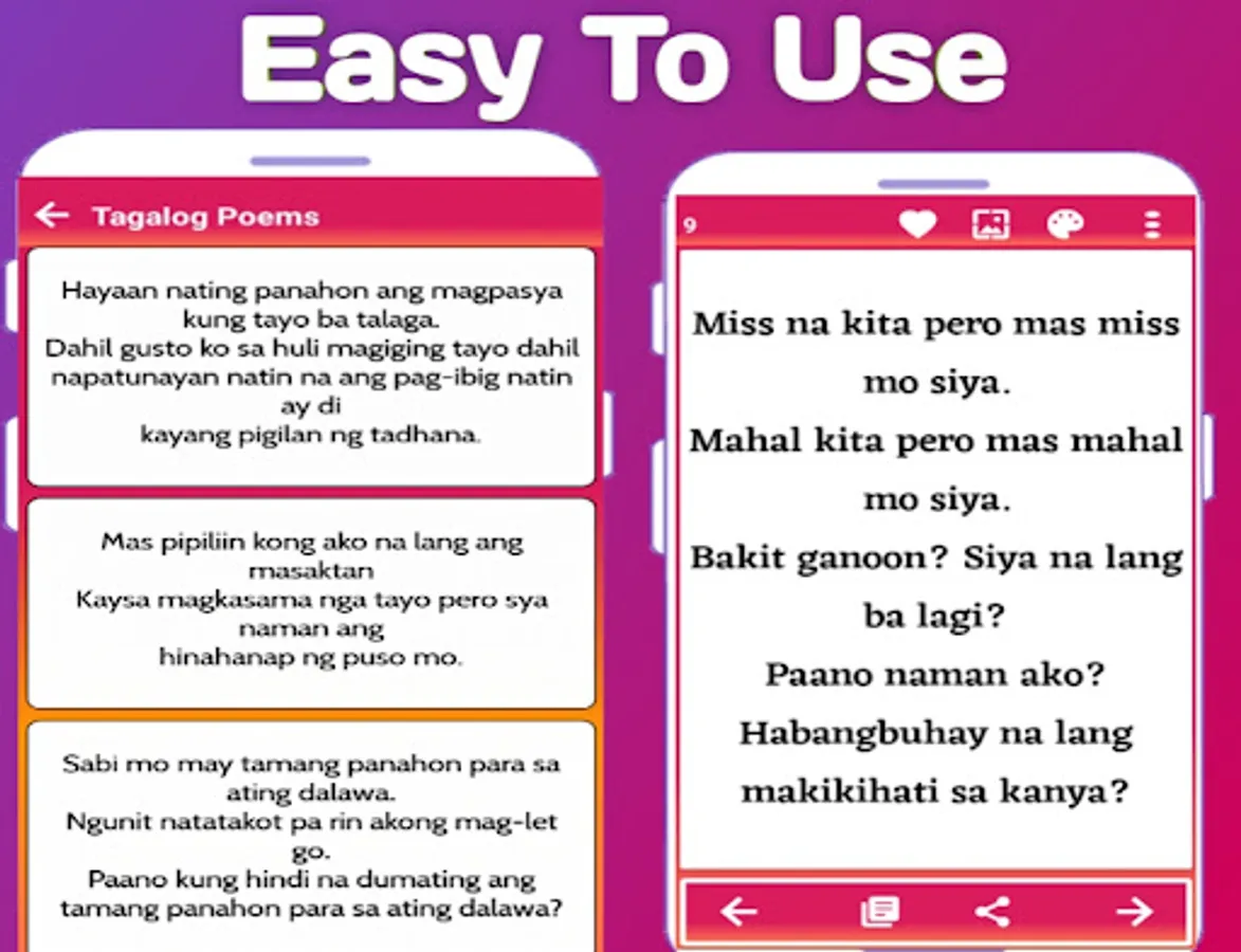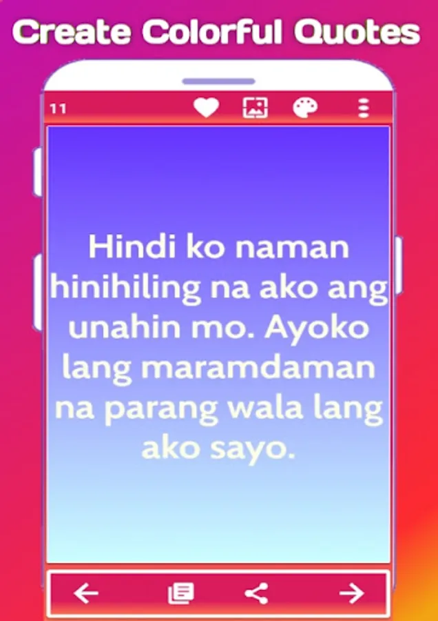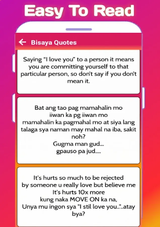 Tagalog Love Quotes In Filipino is a collection of beautiful Quotes, funny, sad love quotes made for the young at hearts that you will surely loved This app. The simple interface lets you enjoy, copy and share the quotes easily your love one or friends.