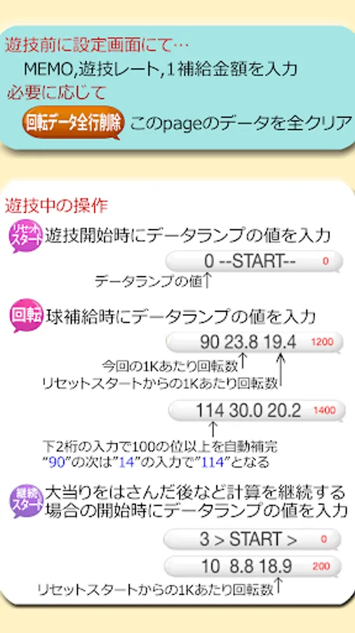 ■以後球補給毎(球貸しボタンを押すごと等)に現在のデータランプ回転数を「まわれくん」に入力し、「回転」ボタンを押していくだけで千円あたり回転率(4円遊技換算)を算出します。