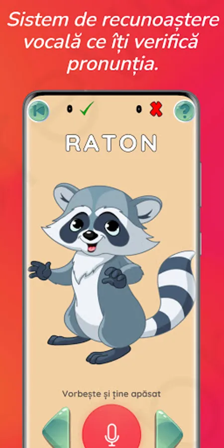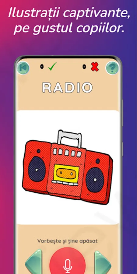 LogoTalkie is the only speech therapy application that uses voice recognition and is aimed at all ages! It is unique in the world! LogoTalkie understands exactly what you tell him! LogoTalkie helps you to: - self-correct and consolidate sound pronunciation. - You improve your diction. - develop active vocabulary. - practice reading and writing skills. - practice attention, patience and self-control of emotions. LogoTalkie is an application for Romanian children everywhere, who want to learn the language or try to improve their pronunciation in Romanian. LogoTalkie is suitable for any age and any diagnosis in the field of language disorders, from speech delay, dyslexia and aphasia, to autism, ADHD and Down syndrome! LogoTalkie was specially designed under the direct guidance of prof. Speech therapist E. Nedelcu from CJRAE Dâmbovița, to become a useful tool in practicing correct pronunciation and diction, developing active vocabulary in children with pronunciation and language disorders and not only, but also adults who need to improve their diction following a stroke. How to use the application: Choose a quiet area! Any noise, no matter how small, can distort the result and another repetition will be needed! Listen carefully to the name of the image, hold down the button at the bottom of the screen and repeat the word heard. Don't be upset if you don't succeed at first. The application is made to practice, not to annoy us! If you really fail, you can move on to the next word and try later. You will have a correct pronunciation when the number of points collected will be maximum and the number of mistakes close to zero. Perseverance, attention, patience and you will succeed!