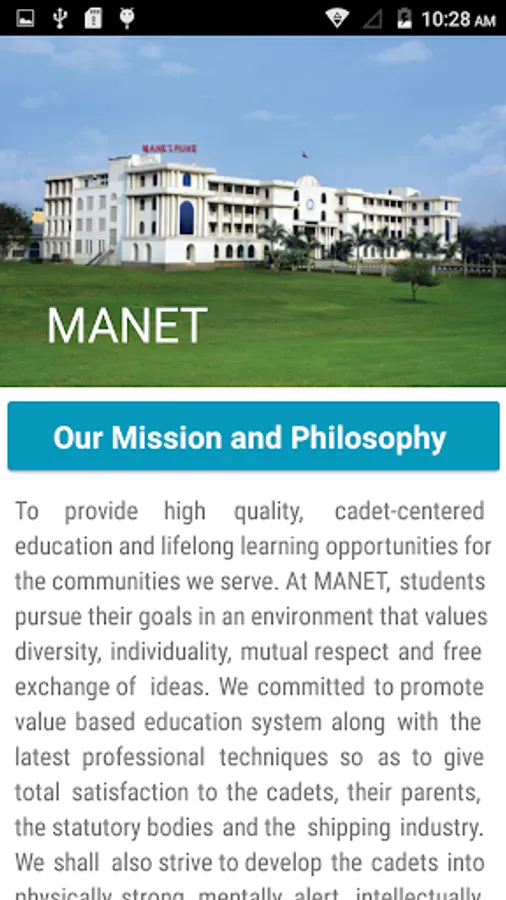 MANET Pune, an academy of Naval Education and Training, aims at imparting high quality, cadet centred education and lifelong learning opportunities to students. The institute strives to develop the cadets into physically strong, mentally alert, intellectually sharp and spiritually elevated winning personalities.