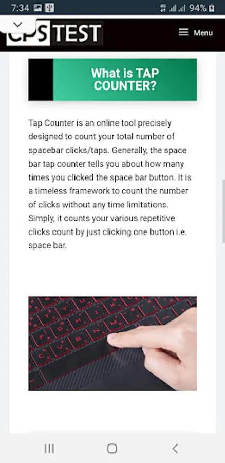 Tap Counter is an online tool precisely designed to count your total number of spacebar clicks/taps. Generally, the space bar hit counter tells you how many times you clicked the space bar button.