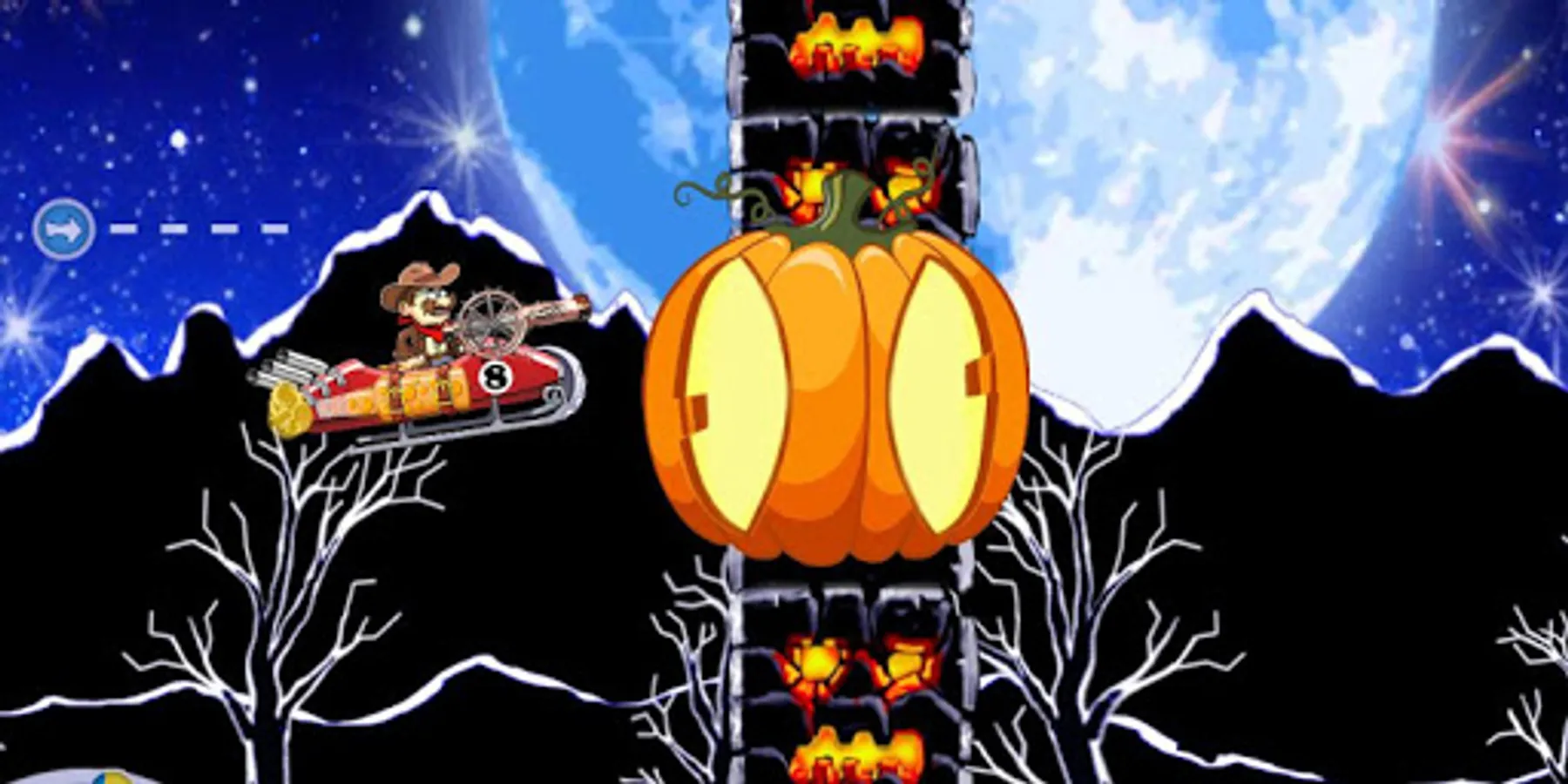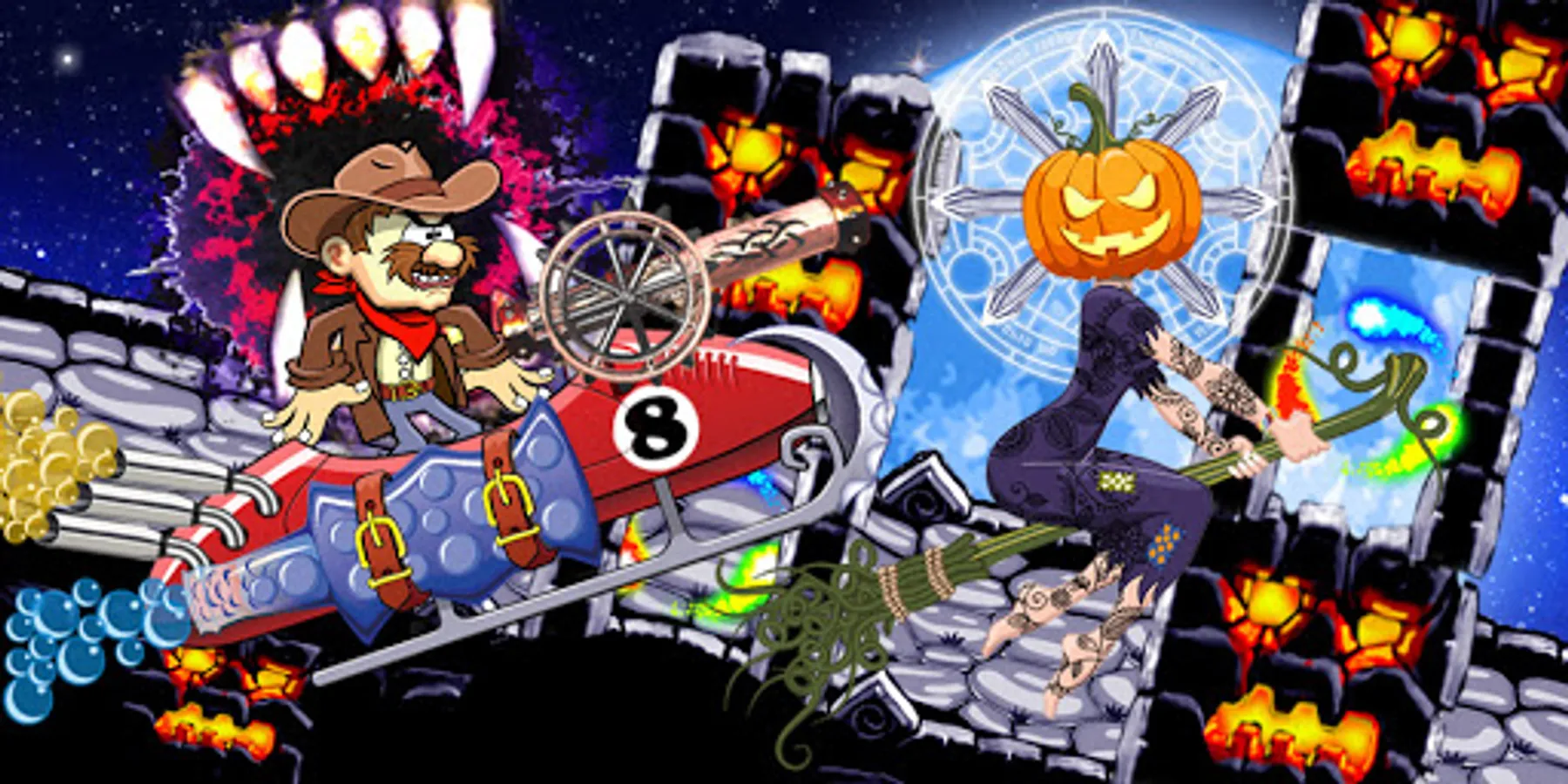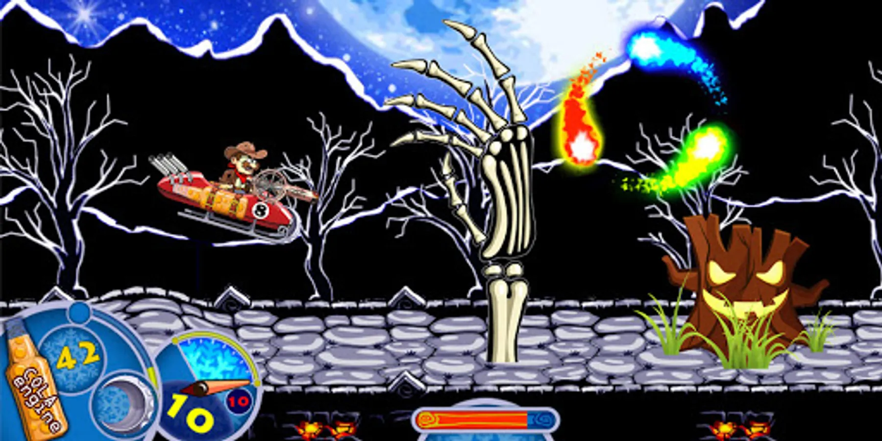 Witches build obstacles and traps. You must overcome them. To do this, it is necessary to improve the properties of the aircraft - the volume of the fuel tank, protection and aerodynamics.