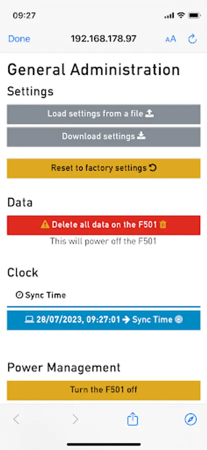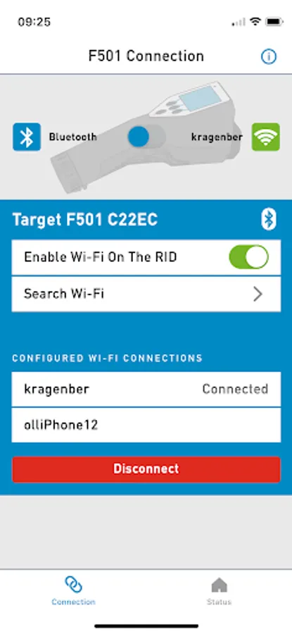 RIDcontrol™ initially connects to a RID via Bluetooth. This Bluetooth connection is used exclusively to connect the RID to the local network or the Wi-Fi hotspot provided by the cell phone. If this connection is established, RIDcontrol™ connects to the RID via this local network. Now pages provided by the internal web server of the RID are displayed in the app. These are special versions of pages that can also be reached via the web interface of the RID.
