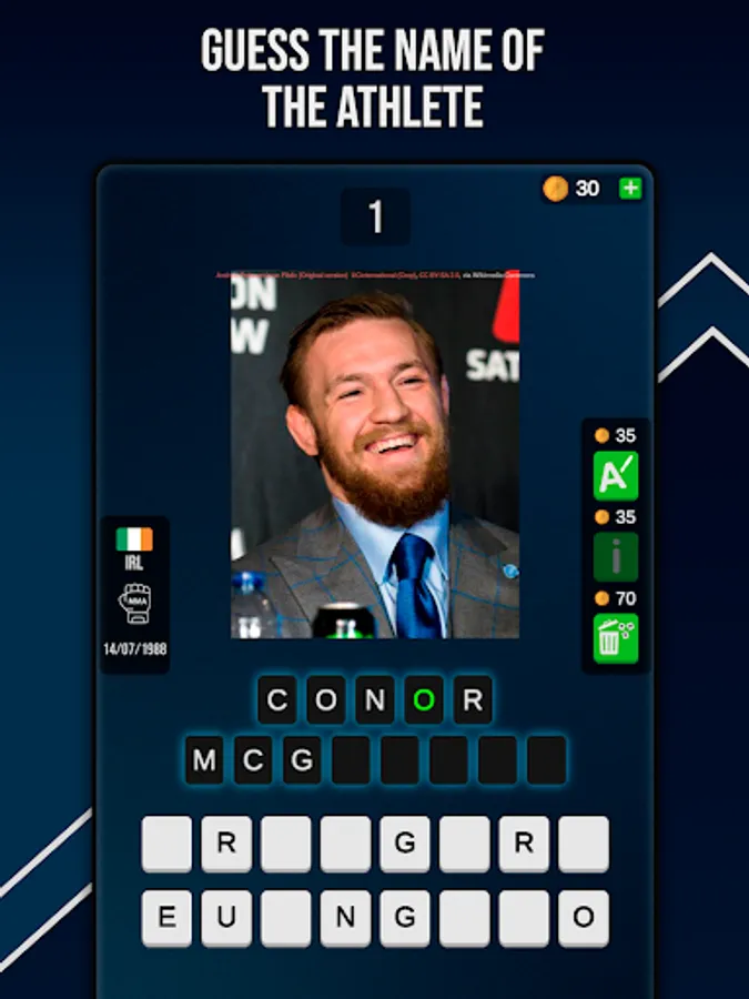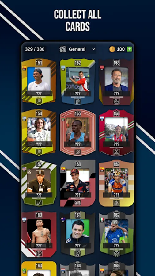 You can find athletes from all kinds of sports such as TENNIS, FOOTBALL, FORMULA 1, BASKETBALL, MOTORCYCLING, MMA, among many others, who will have to guess their name to get their collectible card.
