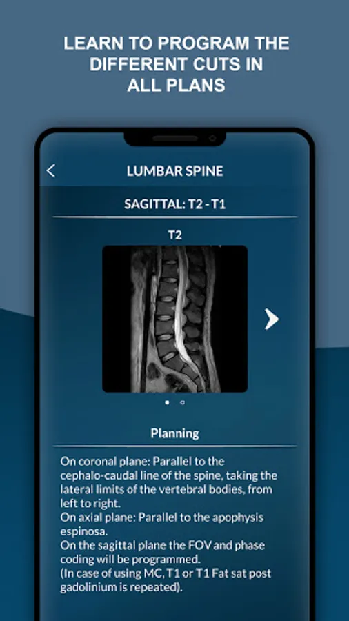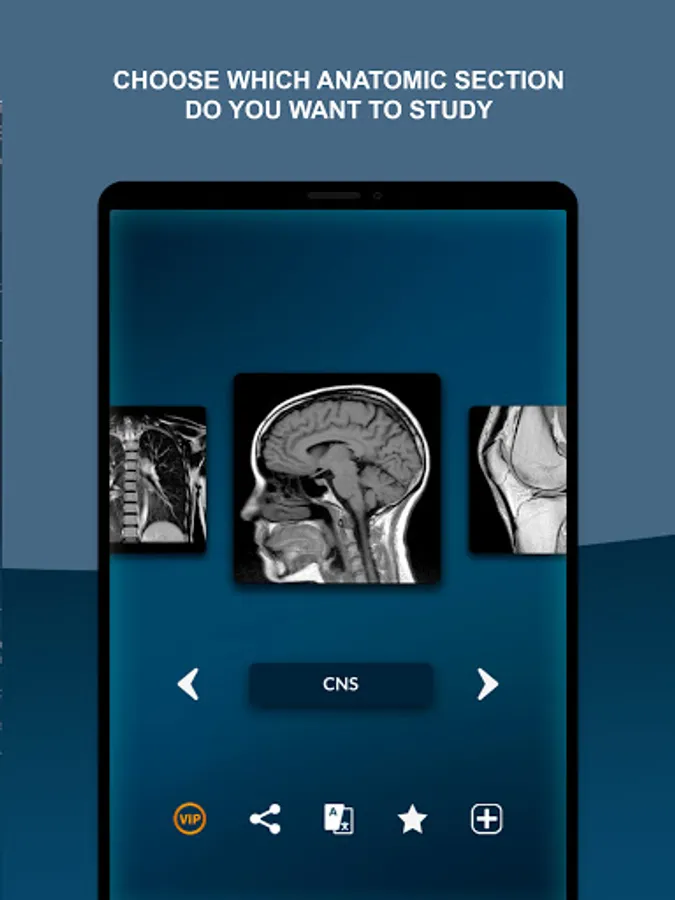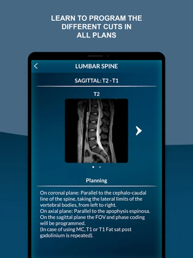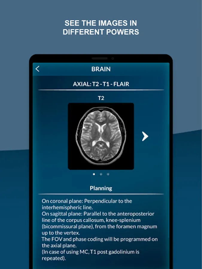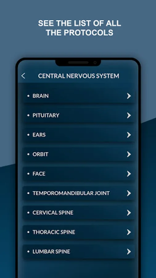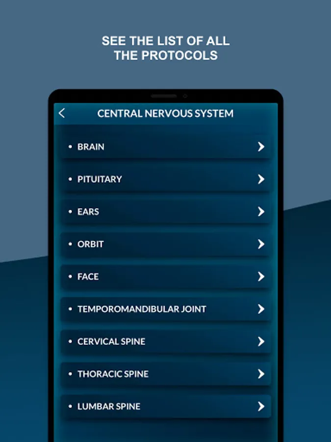 Within the app you will find the protocols divided by sections, Central Nervous System, Trunk and Osteoarticular.