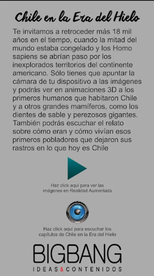 We invite you to go back more than 18 thousand years in time, when half of the world was frozen and the Homo sapiens made their way through the unexplored territories of the American continent. You just have to point your device's camera at the images and you can see in 3D animations the first humans that inhabited Chile and other large mammals, such as saber-toothed and giant sloths.