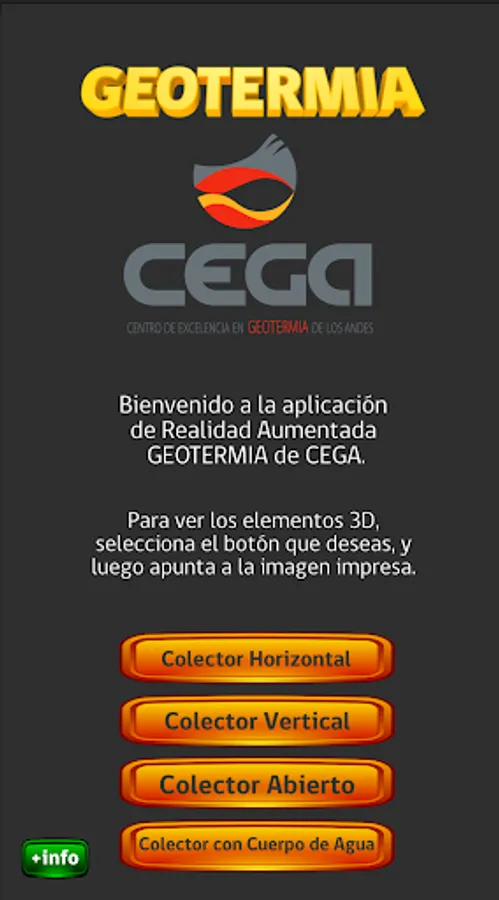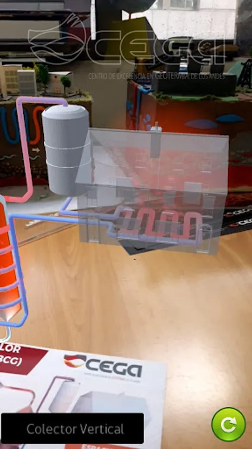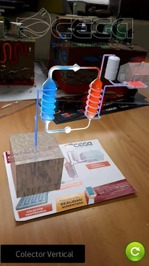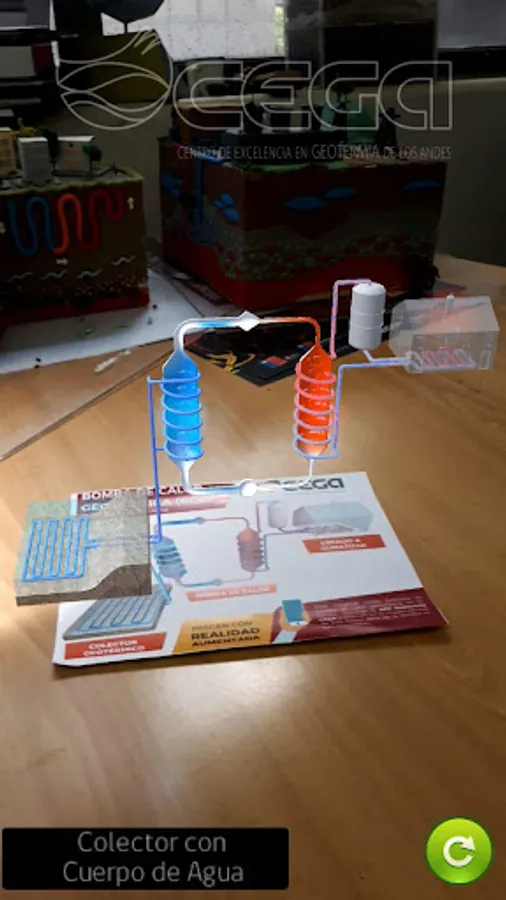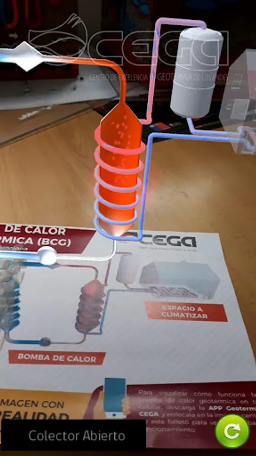 With this APP you can visualize through images with augmented reality, how different types of geothermal systems with heat pump operate. Each system differs in the way underground pipes are installed. Choosing the most suitable one will depend on the characteristics of the available terrain, the climate and the soil conditions. To use this APP you need to have a printed image of the system that you can download from our website www.cega.ing.uchile.cl