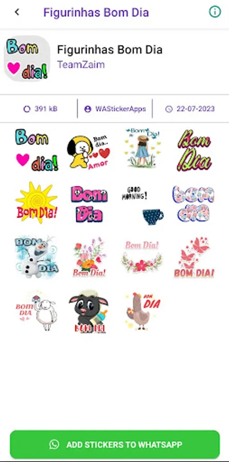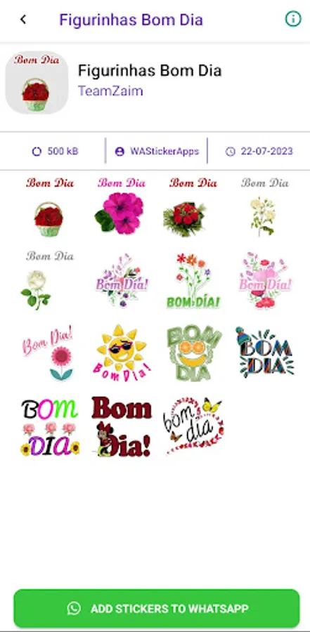 This app has been carefully designed to add a touch of charm to your daily WhatsApp routine. With a variety of adorable stickers, you'll be able to greet friends, family and co-workers in a unique and engaging way. From cute messages to inspirational quotes, "Bom Dia Stickers" offers a wide selection of stickers that are sure to warm hearts and brighten everyone's mornings.